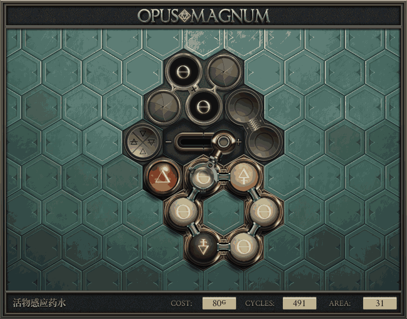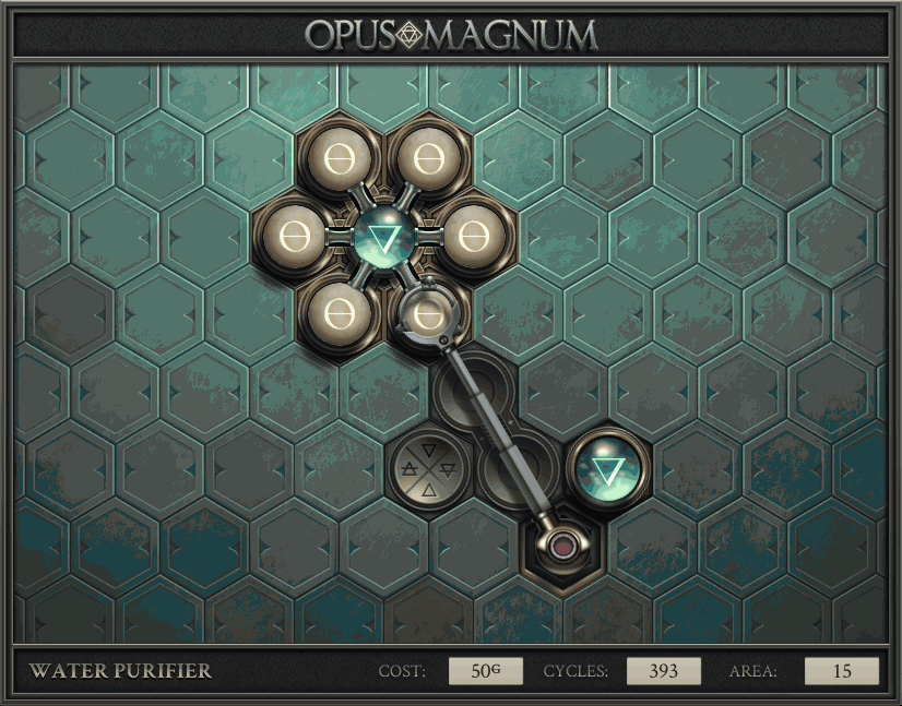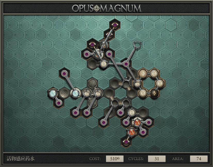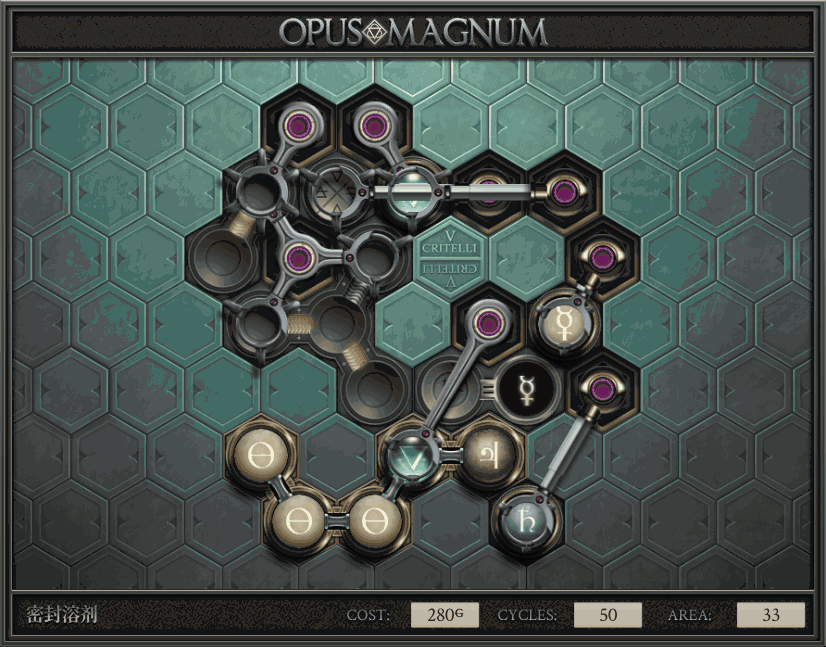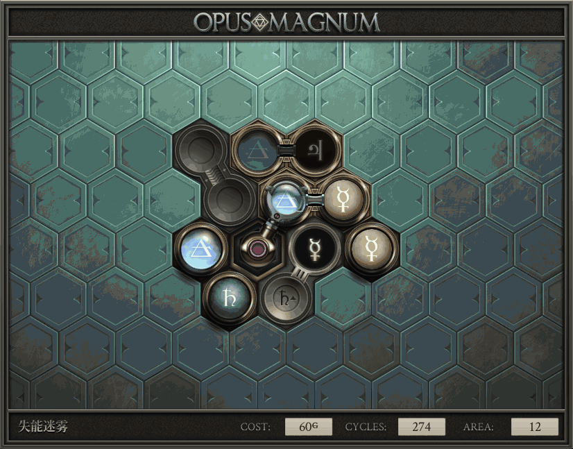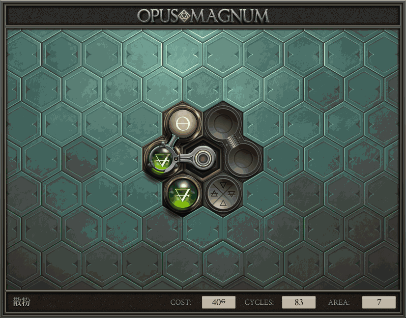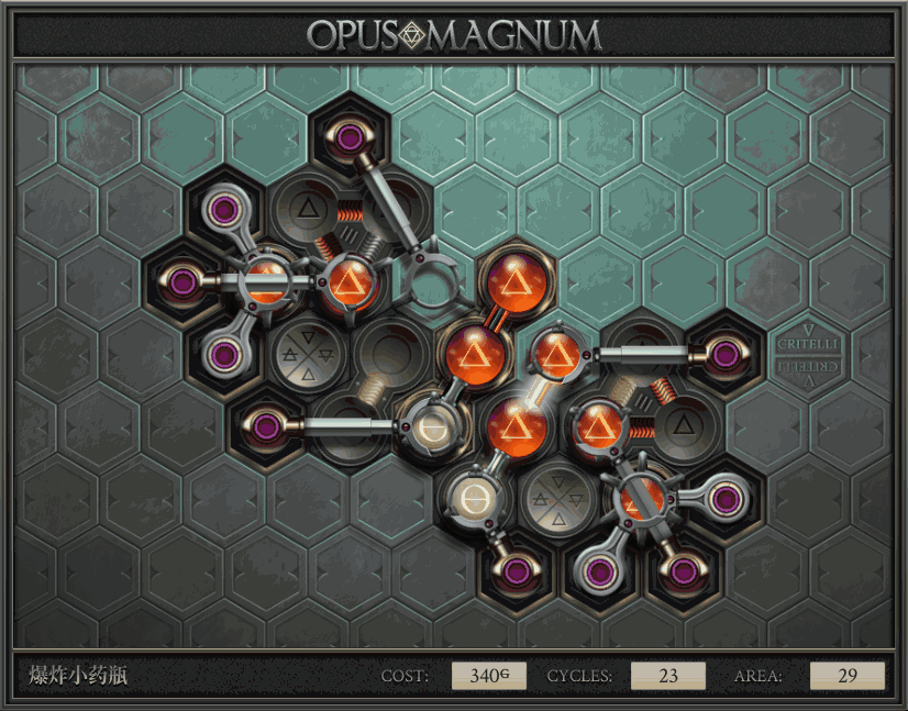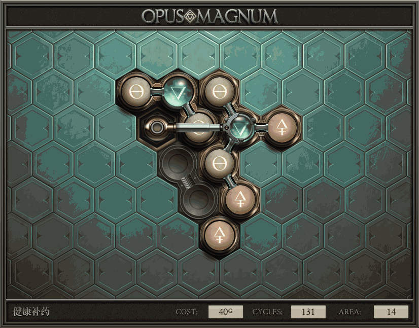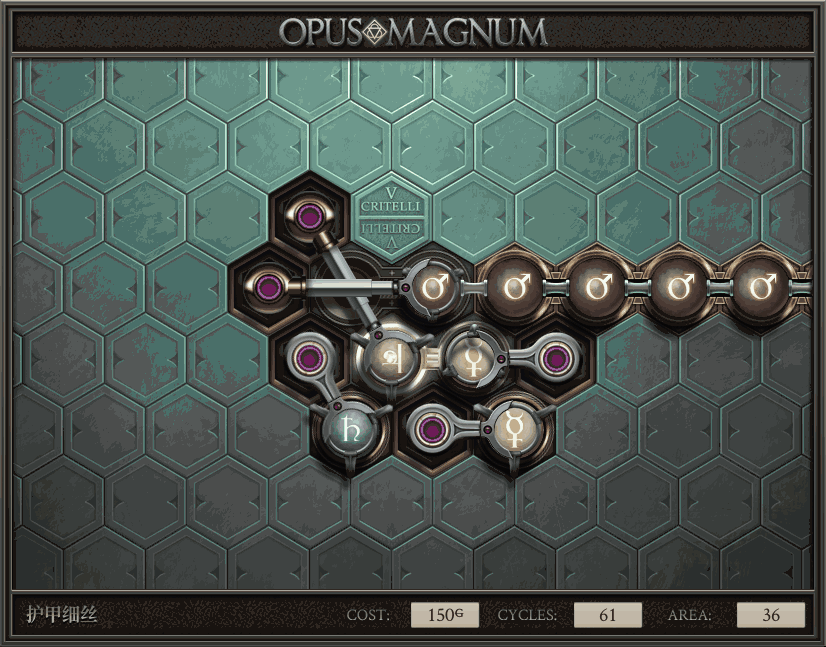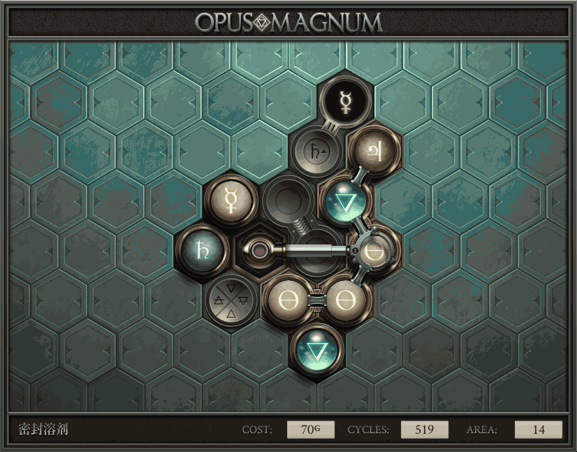 不过没办法,我会回来把它更完的,某天。仍然欢迎留言讨论解法!本篇指南将为每道谜题提供至少一种解法(部分谜题会附带吐槽),并且会在优化过程中持续更新。解法分为三种:便宜(C)、迅捷(Q)和干净(N)(从字面意思理解即可),分别对应游戏中的三种衡量指标:成本(COST)、周期(CYCLE)、面积(AREA)。在优化解法时,我比较倾向于专注优化其中一项指标,但有时单个解法也能达成多个成就。 零.介绍 《opus magnum》与zach以往的游戏相比,最明显的特点是几乎每关都有一个非常明显可达到的理论最优解。这让我们的优化过程变得比较愉快。下面以教学关为例,看看如何抵达最优解。 与zachtroincs以往的游戏相比,《opus magnum》的每关在【便宜】【简洁】【快速】这三个指标上都存在理论最优解,这使得优化过程成为一种“愉快”的体验。这里以教学关为例进行说明。 【便宜】:基本上所有谜题都能用一个操作臂解决。普通操作臂不行就用活塞臂,还不行就用轨道。所以最便宜的解法就是只用一个操作臂的解法(如果必须用到活塞臂或轨道,则可能需要多斟酌一下)。基本上,每个谜题都能用单个机械臂解决,如果不行,就用活塞,如果还是不行,那就考虑添加一些轨道。所以找到最廉价的解决方案就是想办法只用一个机械臂来解决(如果需要轨道,你可能需要再思考一下)。 干净 NEAT:下方没有垫东西时不要旋转枢轴,多用活塞,尽量紧凑排列组件,不要让机械臂空挥。 尽量不要在下方是空单元格时使用枢轴,多使用活塞,将组件排列得尽可能紧凑,尽量不要让机械臂在空单元格上方旋转。 迅捷 QUICK:要弄清楚一件事,从输入端口取出元素的最大速率是每2刻度一个,这需要2个机械臂,把所有过程全部分拆,一个机械臂只做一件事:抓取、做事、复位。这样一来所有机械臂全部是4TICK的周期,大多数情况下可以得到最速解。 只需知道一件事,从输入口提取元素的最大速度是每2TICK一个。所以你需要解决这个流程,让一个机械臂只做一件事:抓取、执行操作、复位。这样所有机械臂就都有一个4TICK的循环,在大多数情况下你能得到最快的解决方案。 一.帝国大学 1.稳定的水元素
