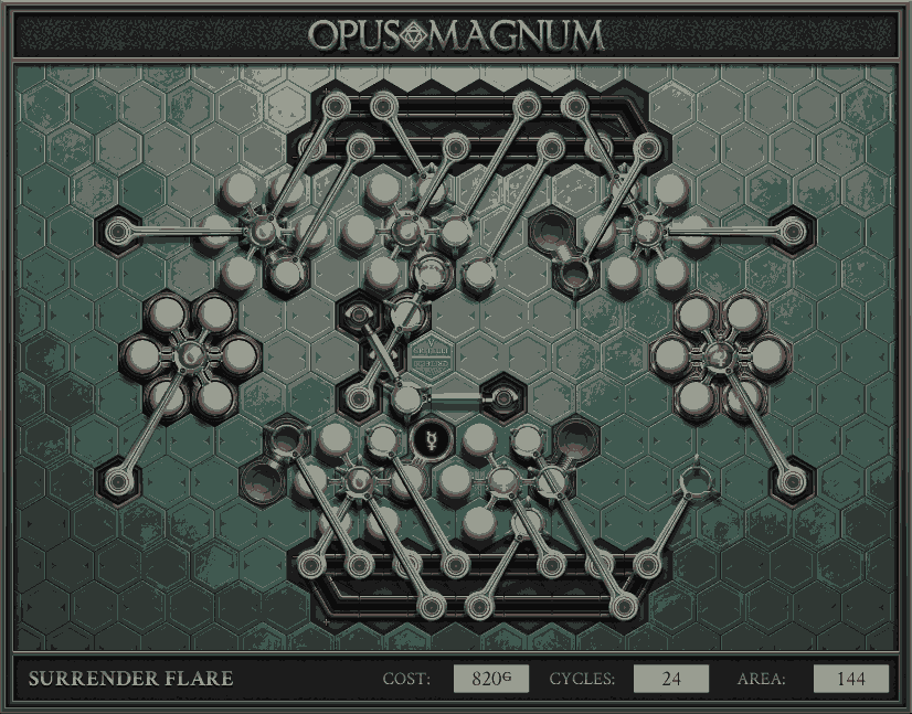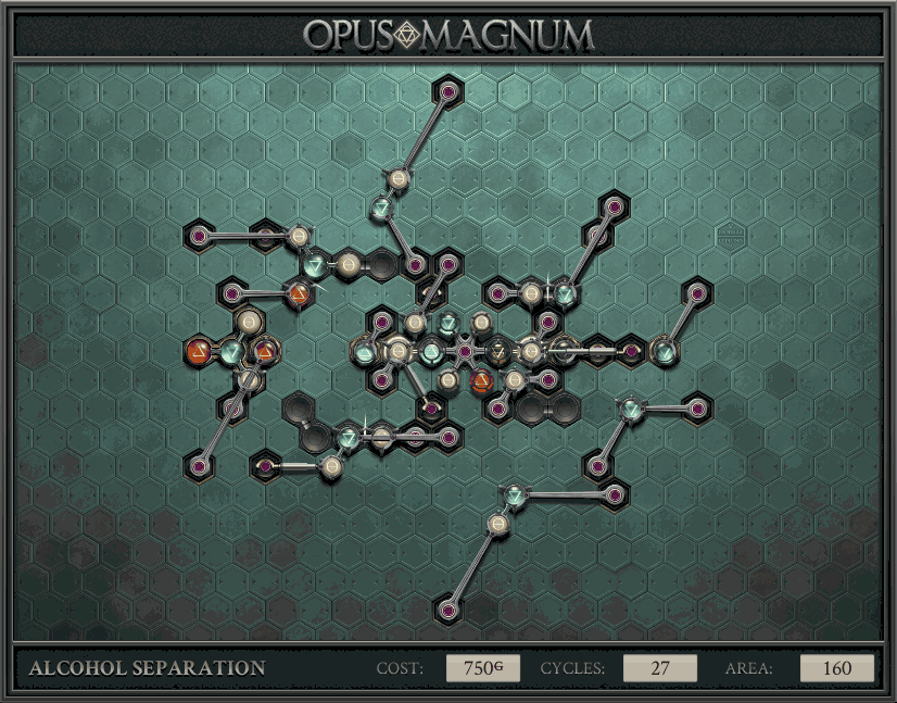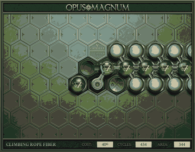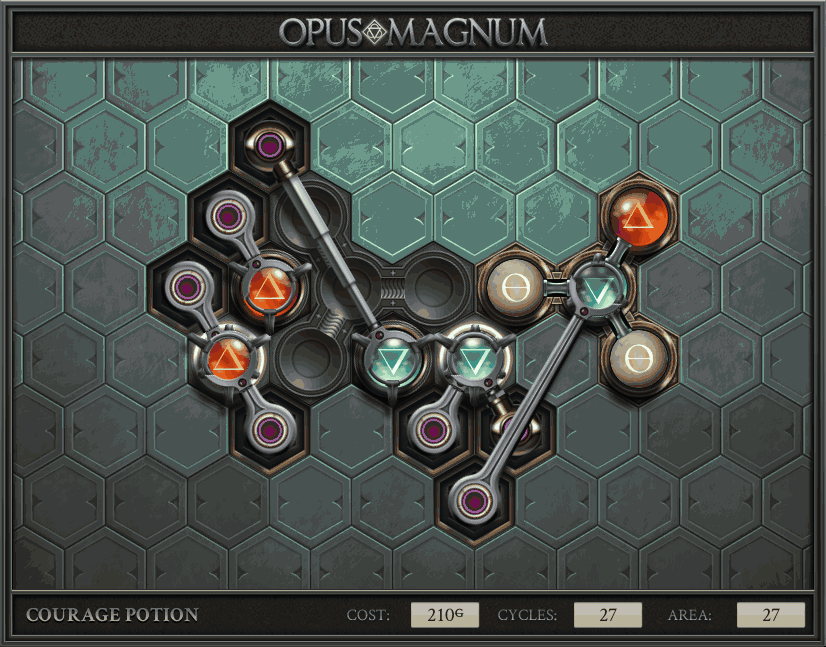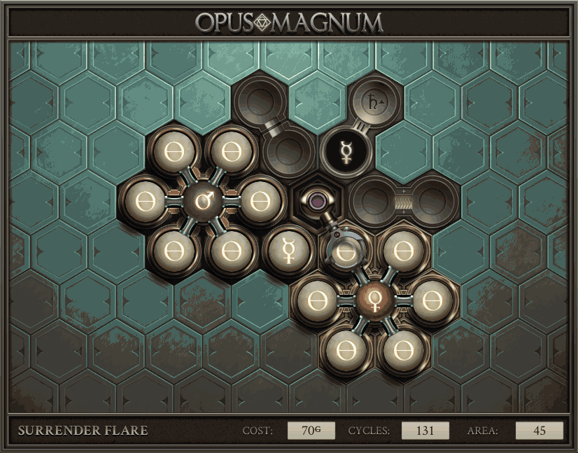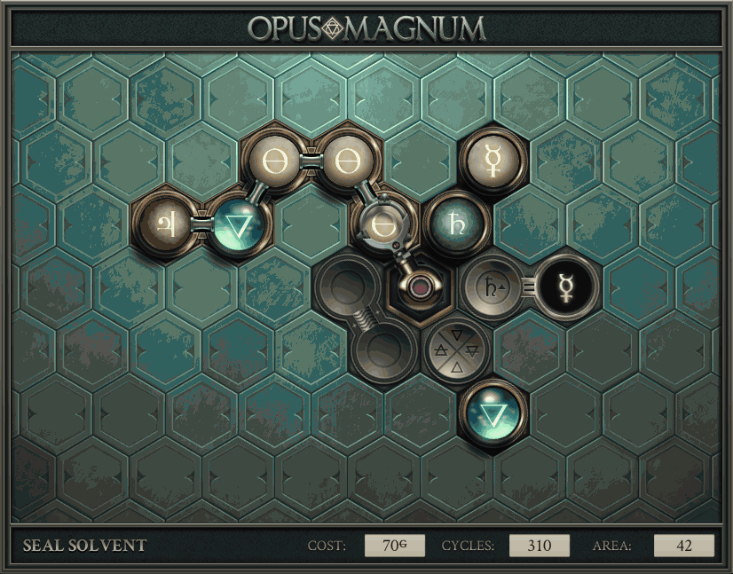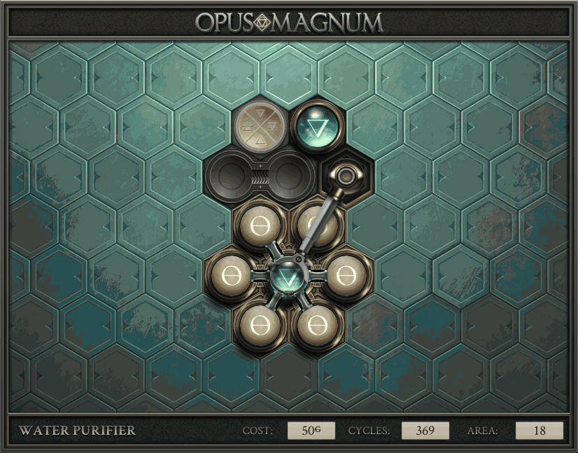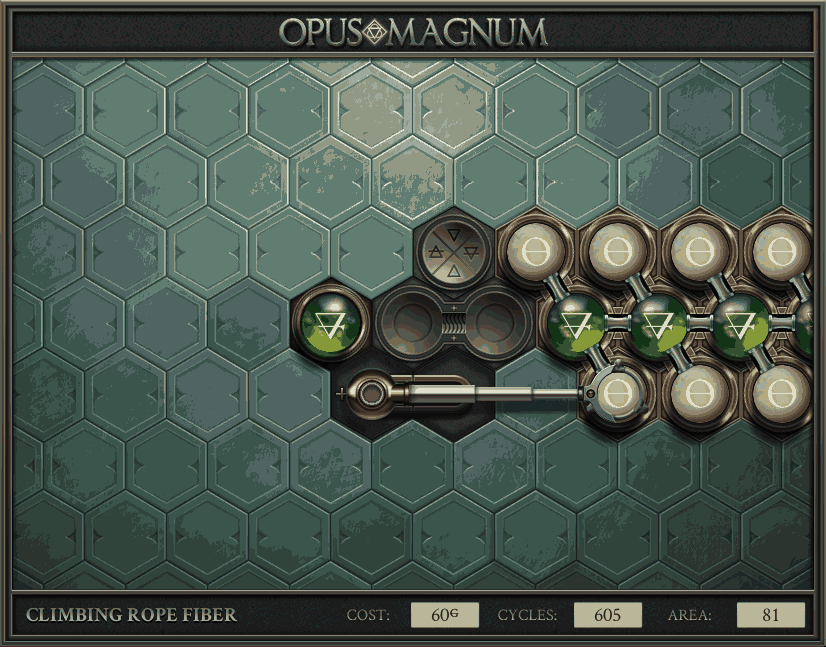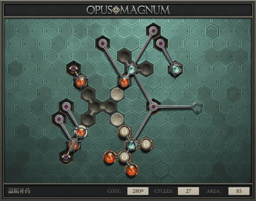 不过没办法,我会回来把它更完的,某天。仍然欢迎留言讨论解法!本篇指南将为每道谜题提供至少一种解法(部分谜题会附带吐槽),并且会在优化过程中持续更新。解法分为三种:便宜(C)、迅捷(Q)和干净(N)(从字面意思理解即可),分别对应游戏中的三种衡量指标:成本(COST)、周期(CYCLE)、面积(AREA)。在优化解法时,我比较倾向于专注优化其中一项指标,但有时单个解法也能达成多个成就。 零.介绍 《opus magnum》与zach以往的游戏相比,最明显的特点是几乎每关都有一个非常明显可达到的理论最优解。这让我们的优化过程变得比较愉快。下面以教学关为例,看看如何抵达最优解。 与zachtroincs以往的游戏相比,《opus magnum》的每关在【便宜】【简洁】【快速】这三个指标上都存在理论最优解,这使得优化过程成为一种“愉快”的体验。这里以教学关为例进行说明。 【便宜】:基本上所有谜题都能用一个操作臂解决。普通操作臂不行就用活塞臂,还不行就用轨道。所以最便宜的解法就是只用一个操作臂的解法(如果必须用到活塞臂或轨道,则可能需要多斟酌一下)。基本上,每个谜题都能用单个机械臂解决,如果不行,就用活塞,如果还是不行,那就考虑添加一些轨道。所以找到最廉价的解决方案就是想办法只用一个机械臂来解决(如果需要轨道,你可能需要再思考一下)。 干净 NEAT:下方没有垫东西时不要旋转枢轴,多用活塞,尽量紧凑排列组件,不要让机械臂空挥。 尽量不要在下方是空单元格时使用枢轴,多使用活塞,将组件排列得尽可能紧凑,尽量不要让机械臂在空单元格上方旋转。 迅捷 QUICK:要弄清楚一件事,从输入端口取出元素的最大速率是每2刻度一个,这需要2个机械臂,把所有过程全部分拆,一个机械臂只做一件事:抓取、做事、复位。这样一来所有机械臂全部是4TICK的周期,大多数情况下可以得到最速解。 只需知道一件事,从输入口提取元素的最大速度是每2TICK一个。所以你需要解决这个流程,让一个机械臂只做一件事:抓取、执行操作、复位。这样所有机械臂就都有一个4TICK的循环,在大多数情况下你能得到最快的解决方案。 一.帝国大学 1.稳定的水元素