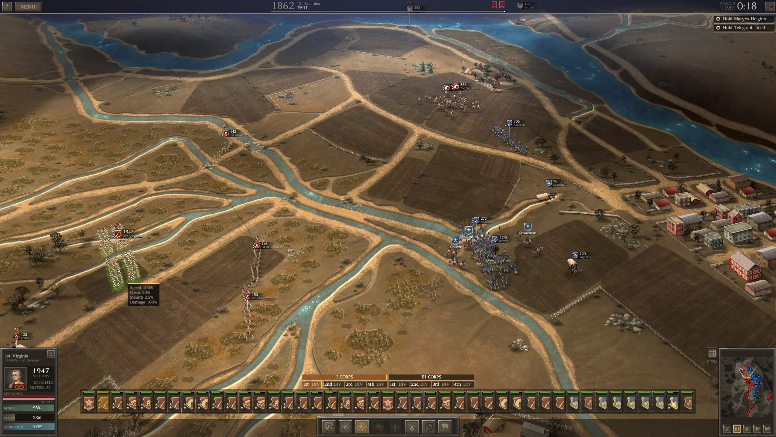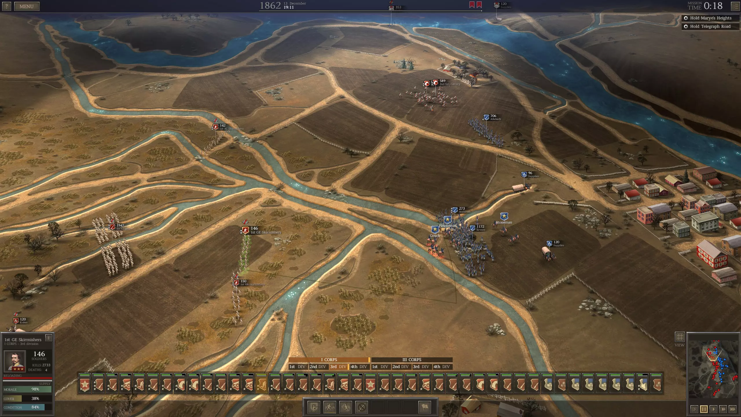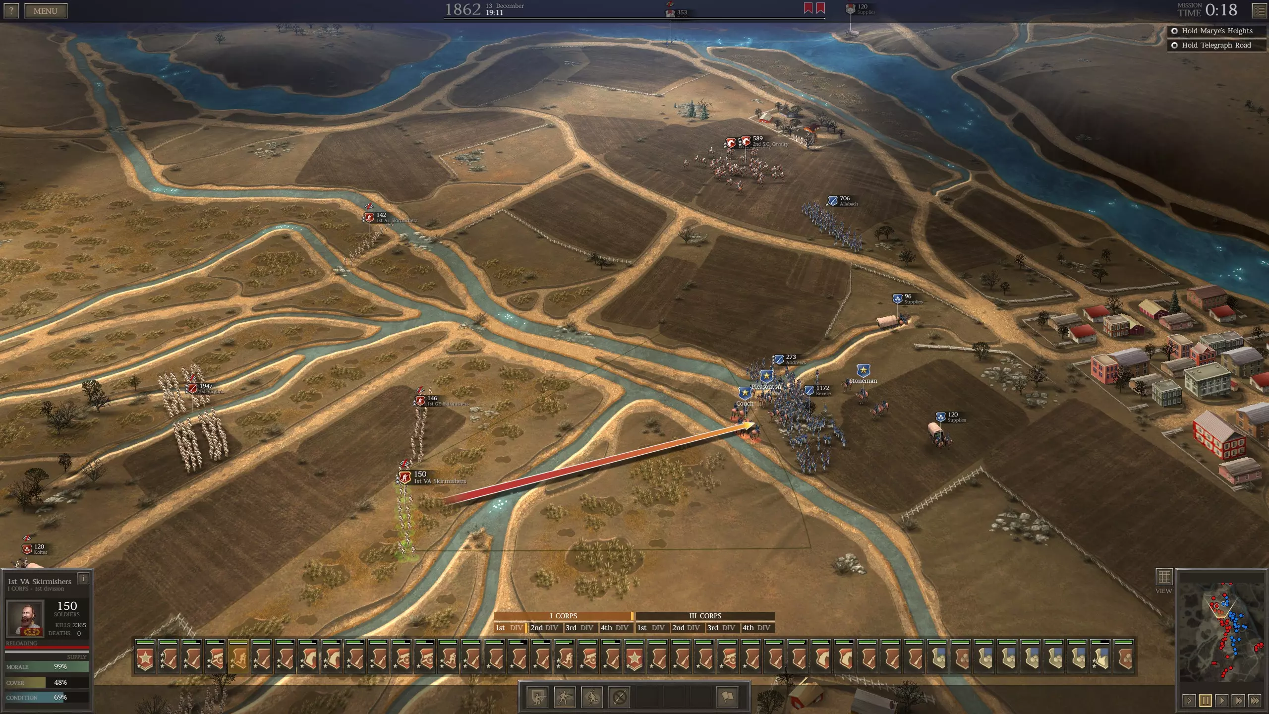 侦察 奇怪的是,我实际上不建议将散兵用作侦察单位。考虑到提升这些单位经验所付出的努力以及其装备成本,它们往往不适合承担侦察敌方阵地所固有的风险。通常情况下,分遣散兵在执行这项任务时表现同样出色,且风险要小得多。事实上,听起来可能有些滑稽,但让分遣散兵与你的专用散兵一同行动,以便它们能为你的狙击手标记敌人,或许是明智之举。散兵损耗 与骑兵类似,散兵在战斗中不仅容易遭受损失,而且损失对其表现影响极大,同时还需要维持他们的经验以及考虑其武器装备的高昂成本。因此,使用散兵时,将损失控制在低水平是一项重要任务。幸运的是,做到这一点并不难,因为散兵的低侦测能力使他们能够在行动时避免引起敌人步兵、炮兵的射击或骑兵的追击。所以,散兵应尽可能利用这种低侦测能力,这是目前保持低伤亡率的最佳方法。同样地,要让散兵远离任何暴露在敌人视野中的常规部队,因为散兵吸引的敌方步兵或炮兵火力会对周围部队产生一定的溅射效果,若不注意,可能会导致部分散兵伤亡。同样,散兵最大的敌人是敌方散兵,他们比常规步兵能更好地侦测到你的散兵,因此在可行的情况下,应尽快用骑兵或常规步兵消灭敌方散兵。最后,将散兵部署在掩蔽处不仅能提升他们本就较低的侦测能力,还能更好地保护他们免受敌方火力伤害。尽管由于散兵的使用特性,在实际作战中往往难以获得此类掩护,但在可行的情况下,这种掩护仍然非常有用。 进攻与防御:进攻 散兵在战斗中的实际运用部分取决于战场地形,但更多地取决于战斗任务的性质。如前所述,进攻战往往不利于专门散兵的使用,至少在我的经验中是如此。在进攻时,通常的重点是将最大火力集中在尽可能小的攻击方向上,以获得最佳效果。虽然理论上让所有步兵部队集中火力攻击单个敌方单位,能迅速击溃该单位并转向攻击下一个或其他遇到的单位,但这种做法并非总能实现。对于这种高度集中且通常推进迅速的进攻,散兵在己方势如破竹的步兵编队所形成的火力网中,作用微乎其微,而且使用散兵需要过多的微操作和精力,却只能带来相对有限的收益。不过,这并不是说散兵不能用于进攻,只是他们的使用要取决于非常特殊的情况。进攻时使用散兵的最佳时机,是攻击那些防守阵地几乎没有掩护的敌军,因为这样散兵能获得很高的击杀率,并能显著提升对敌军单位的士气伤害。一个很好的例子是作为南方邦联(CSA)在马尔文山战役中,南方邦联可以在无法徒涉的河流对岸,从联邦军左翼部署散兵,并利用那里树林提供的掩护。在那里,通常会有几个联邦旅部署在最左侧联邦防御工事后方的预备位置。这些部队会成为散兵的理想目标,因为在很多情况下,他们会侧对着散兵,承受大量伤亡和士气损失,却无法有效反击。通过这种方式攻击,可以在常规步兵发起主攻前显著削弱敌人的阵地,不过这类方法通常需要较长时间才能达到预期效果。因此,它们最适合用于那些时间限制不紧迫的战斗,或者敌人近期没有预定增援部队到达的情况,因为增援的到来可能会极大地改变你赢得战斗的能力。进攻与防御:防御 散兵真正发挥作用的地方是在防御中。进攻需要在单点集中大量兵力,而防御由于AI的特性,要求玩家分散兵力以保护目标以及任何对防御这些目标具有战术价值的地标。在这种情况下,你军队中的大多数常规步兵旅在战斗的大部分时间里会保持在静态、高掩护的位置,这使得散兵的部署和运用变得更加简单和有效。正如本指南前面部分所提到的,散兵的最佳位置是侧翼,在那里他们既能造成更大的伤亡,也能造成更大的士气打击。由于AI的部队在溃败后重新集结时,通常会反复从同一区域发起进攻,因此你往往无需花费太多精力就能为散兵找到良好的作战位置,只需稍加留意确保他们按命令行动,而非游戏随机判定的行为。 同时,散兵的隐蔽能力大幅降低了他们在侧翼阵地受到攻击或火力打击的几率,而常规步兵单位则可能面临这种情况。这不仅让散兵能够避免伤亡,还能近乎不受阻碍地持续袭扰敌方脆弱阵型。 结论
