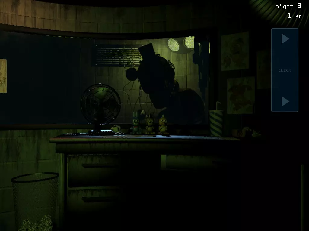 我之前写过二代的攻略,提高了游戏技巧,花了3小时就通关了三代并拿到三星,把游戏技巧练到了极致,于是决定再写一篇攻略。我会把所有学到的东西都分享出来。 前言(可能没人会看)。 各位,我在莫斯科时间凌晨4点游戏一解锁,就立刻花了190卢布买下游戏,准备好干净的衣服,戴上耳机以免晚上玩游戏吵醒妈妈,然后开始体验期待已久的斯科特·考顿的作品。说实话,心情挺复杂的。 真期待第四部里他彻底消失,毕竟剧情里还有一家没提到过的披萨店呢。等等…… 换汤不换药。没错,有监控。没错,有电子玩偶(咳咳,其实就一个,抱歉)。没错,要撑到早上6点。但生存手段确实改了不少。下面详细说说。 bug。崩溃。BUG太多了,简直是BUG的海洋,还老是崩溃!重新开始夜晚?50%的概率会崩溃。更新:崩溃问题已修复。点击屏幕中间偏下的位置?游戏会最小化,这是为什么?看着地图中间的摄像头,看到动画了吗?如果他同时跑到办公室玻璃前,十几秒后就会带着【赌徒】的气息出现在你面前,可别惊讶。更新:据凯文所说,“这不是BUG,这是特性”。再更新:游戏里有2个弹簧陷阱。是的,就像我自己知道的那样,我“自己知道做了些什么”就是这样。