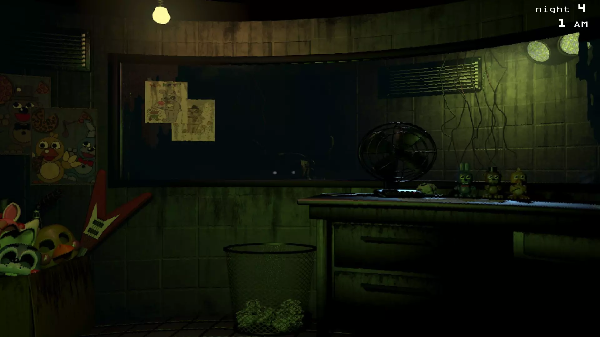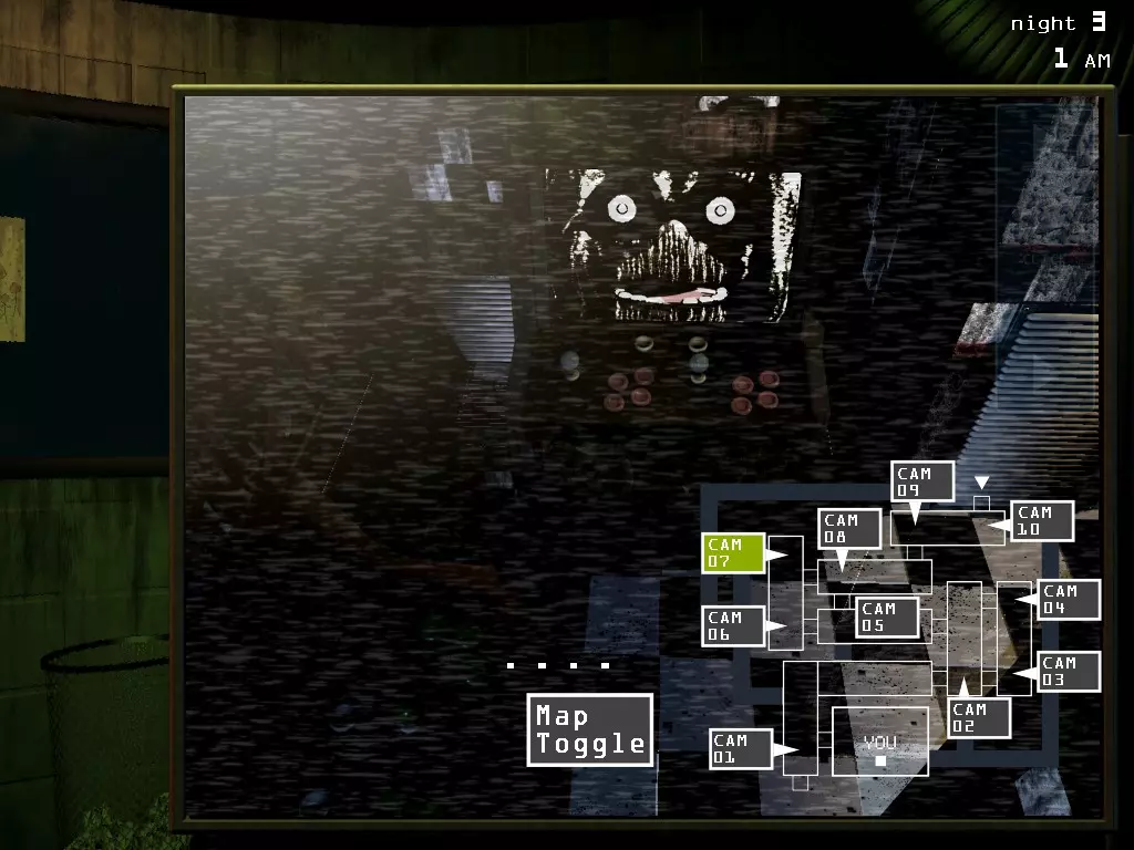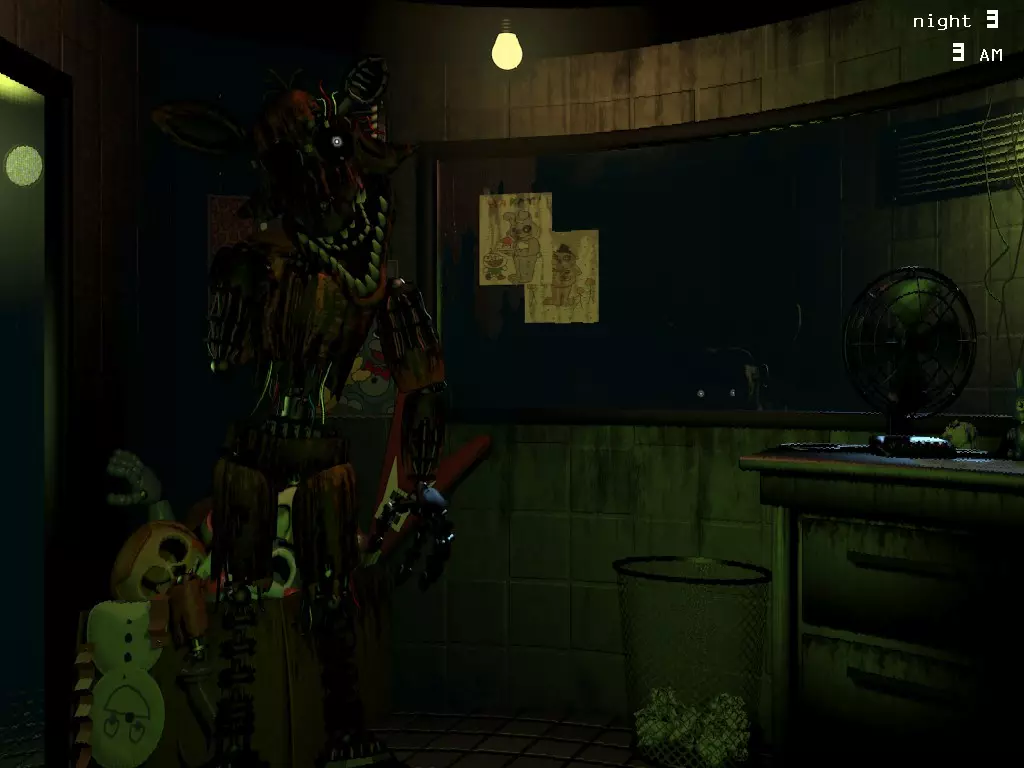 唯一能杀死我们的存在。它通过以下方式达成目的: 1. 从地图起点一路穿过所有房间进入办公室。在它移动期间,我们可以通过音频系统对其移动产生显著影响。但它离办公室越近,这种影响的机会就越小。比如,当它已经站在门外时,只能暂时将其驱赶到我们附近的1号摄像头。顺便说一下,在凌晨5点时,这或许能起到一定的拯救和拖延作用。2. 它试图通过通风管道抄近路。要阻止它,需要及时关闭通风管道中的隔板,方法是双击它试图攀爬的竖井摄像头。 3. 不清楚这是它自己的行为还是与主角有关。一旦有机会,就会召唤出动画电子玩偶的幻觉,看到这些幻觉不仅会被吓到,还会导致一个系统损坏。可能是它自己,因为如果它试图钻进通风管道,而我们碰到了那个家伙,那么很可能就是通风系统会出故障。 4. 在它干掉我们之前,可能会有很多动静。如果它在办公室窗户前跑过,或者从办公室通道的右拐角处张望,这意味着我们还能把它引回2号摄像头的监控范围。如果它直接从左边盯着看——那一切都完了,只能祈祷并尝试把它引到办公室的1号摄像头监控下。如果在查看监控时,有东西跑到办公室右侧——3…2…1… 幻影弗莱迪