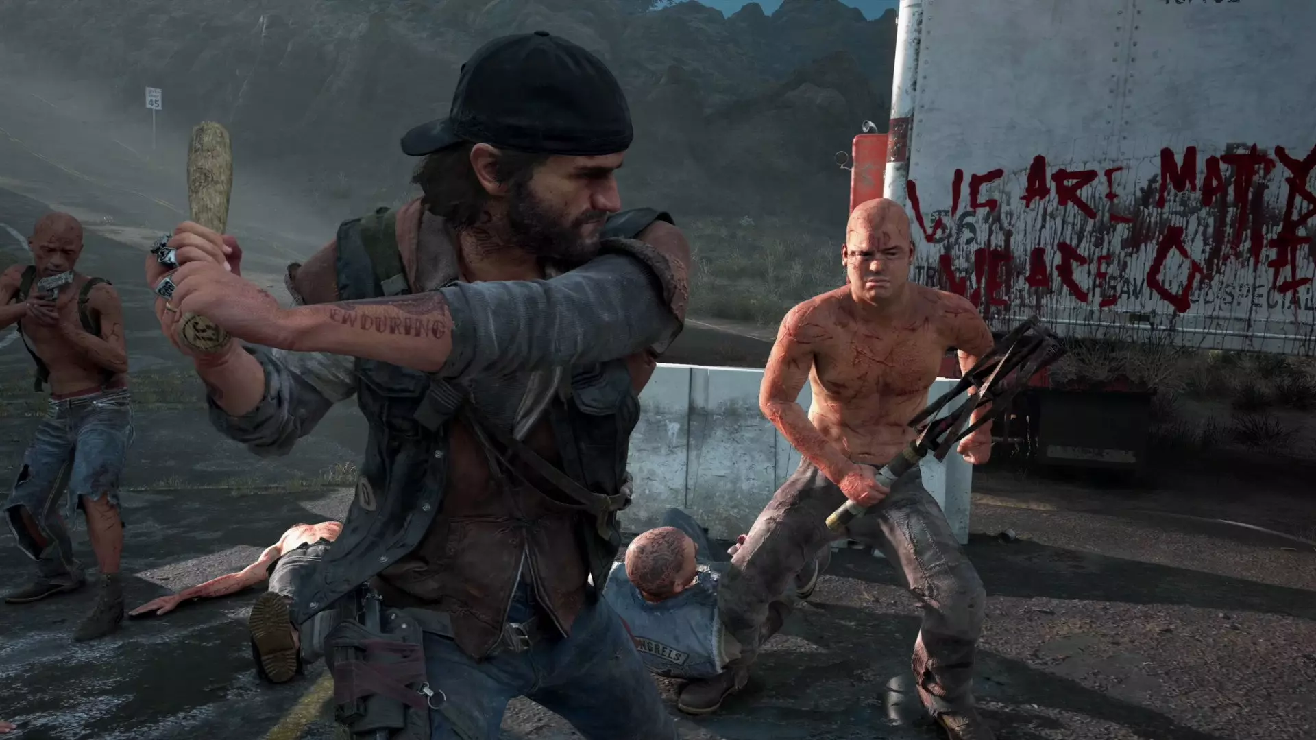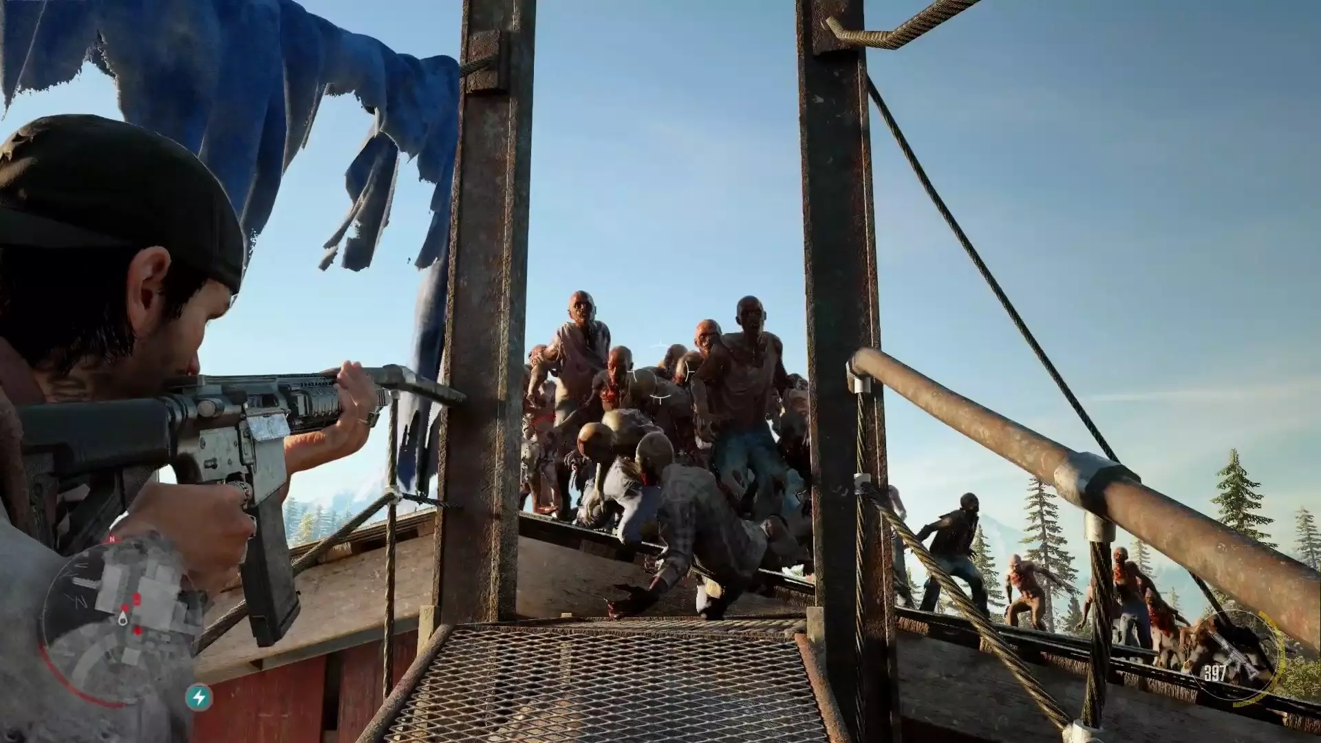 在本作中,玩家遇到的敌人绝大部分都是暴徒,虽然还有安息者等其他敌人,但本质上类似。暴徒的作息时间与异变者相反,他们通常只在白天出没,会携带近战武器或枪械。和随处可见的异变者不同,大部分暴徒会试图伏击敌人。常见的伏击点包括各种补给站(例如检查哨和加油站)。此外,他们还会在马路上放置绳子,很容易被发现,一旦中招主角就会摔下车,机车的耐久度也会瞬间降至最低。最后一种埋伏方式是狙击手,他们会待在树上向行驶中的玩家射击,命中率很高,玩家看到红外线瞄准后需要立即下车寻找掩体。 成就要点 6. 声音相关