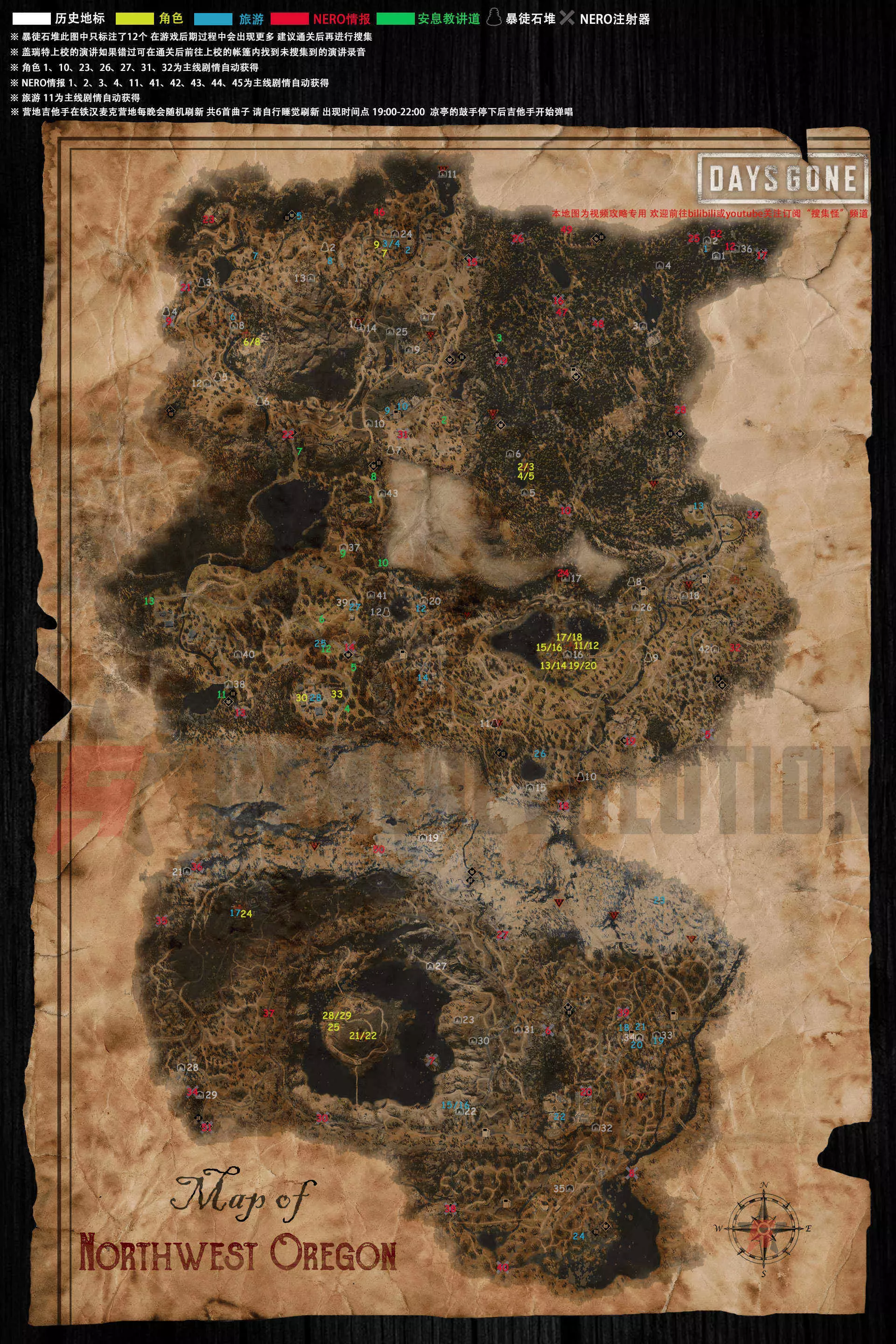 游戏总共有240个收集品,玩家需找到其中180个才能解锁奖杯。收集品分为以下几类: 角色:部分会随着流程推进解锁,部分角色的收集位置就在他们的住处。 NERO情报:绝大部分直接放在NERO检查哨和研究区中,非常明显。 莎拉的实验室纪录:随着流程解锁。 自由奥勒冈电台:随着流程解锁,仅在玩家离开营地骑车时触发。 盖瑞特上校的演说:在故事推进到巫师岛后,会随着流程推进解锁一个支线任务,前往触发即可,可能会错过。 安息教讲道:仅在安息教领地,即艾隆孤峰区域可以找到。靠近时会听到扩音器的声音,顺着声音找到并破坏扩音器即可。旅游:比较隐秘的一类收集品,分布在地图的各个区域,多半会出现在一些旅游景点或者商店当中。 历史地标:这些地标会在玩家靠近或者清理完埋伏营后解锁,由于大部分都在路边,找全并不是什么难事。 草药学:每到一个新区域后看到草就捡。 营地吉他手:在铁汉麦克营地的亭子里,夜晚会有NPC在弹吉他,NPC出现后小地图会出现图标提示。 剧情线成就