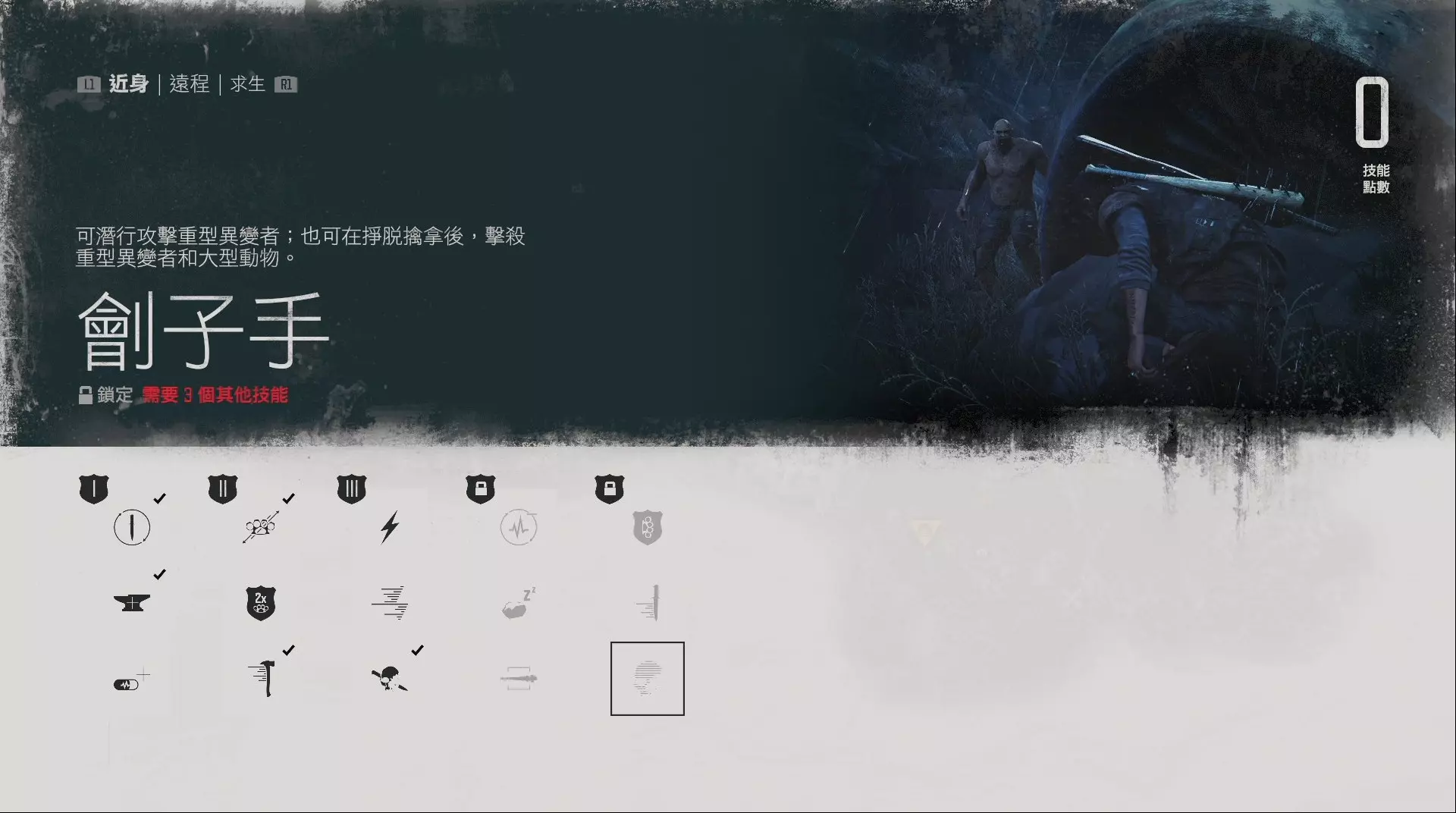生存既是生活以生存模式通关。生存模式和其他模式的最大区别在于UI全部消失并且不能快速移动,流程难度倒是没有什么太大的区别,毕竟本作一般难度下主角本来也不怎么经打。敌人的攻击力和HP都提高了,但AI方面并没有太大的长进。UI消失的最大麻烦在于不能确认自己现在的HP剩余量。另外由于不能快速移动的缘故,玩家需要时刻注意自己机车的燃料剩余量,在生存模式下没油是一件非常危险的事情。 技能方面优先点【专注射击】【当场维修】和【独挑大梁】,NERO处拿到的药物优先提升自己的HP和耐力。生存模式的难点主要体现在初期,在资源不足的情况下,玩家很难对付大群异者。推荐玩家尽量在敌人较少的白天行动。游戏中后期来到地图南边并获得强力武器后,难度会直线下降。武器方面推荐【芝加哥打字机】和【RDP】,这两把武器需到【巫师岛】营地才能解锁。