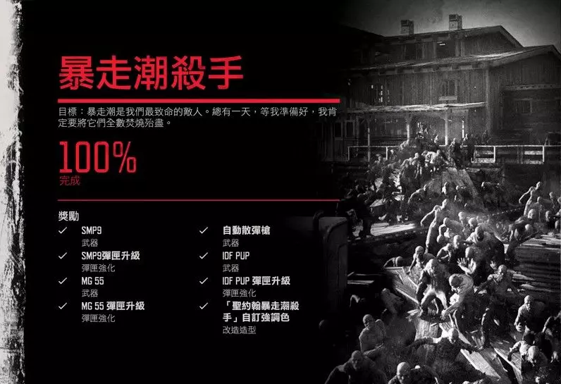 分秒必争60秒:在1分钟以内以生存模式击败暴走潮。虽然看起来很难,但实际上还好。后期前往北边人数较少的暴走潮,利用引诱装置和烧夷弹的组合可以快速清理敌人,玩家还可以用芝加哥打字机补刀,快的话不到30秒就能完成。担心搞不定的玩家别忘了提前存档。 额外成就:挑战模式(DLC 2)
