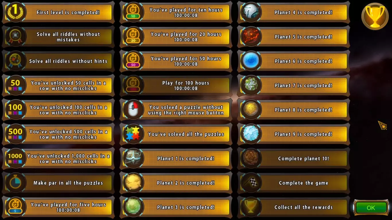 所有谜题均无错误解开 所有谜题均无提示解开 所有谜题均达到标准完成 游戏时长达到50小时 游戏时长达到100小时 第10星球已完成! 游戏完成! 已收集所有奖励 注意:完成其他星球等成就可能已解锁或未解锁! 仅当你已完全完成游戏但部分成就因bug未解锁时,或已完成所有内容但不想挂时长至50和/或100小时时,才应使用我的存档文件。