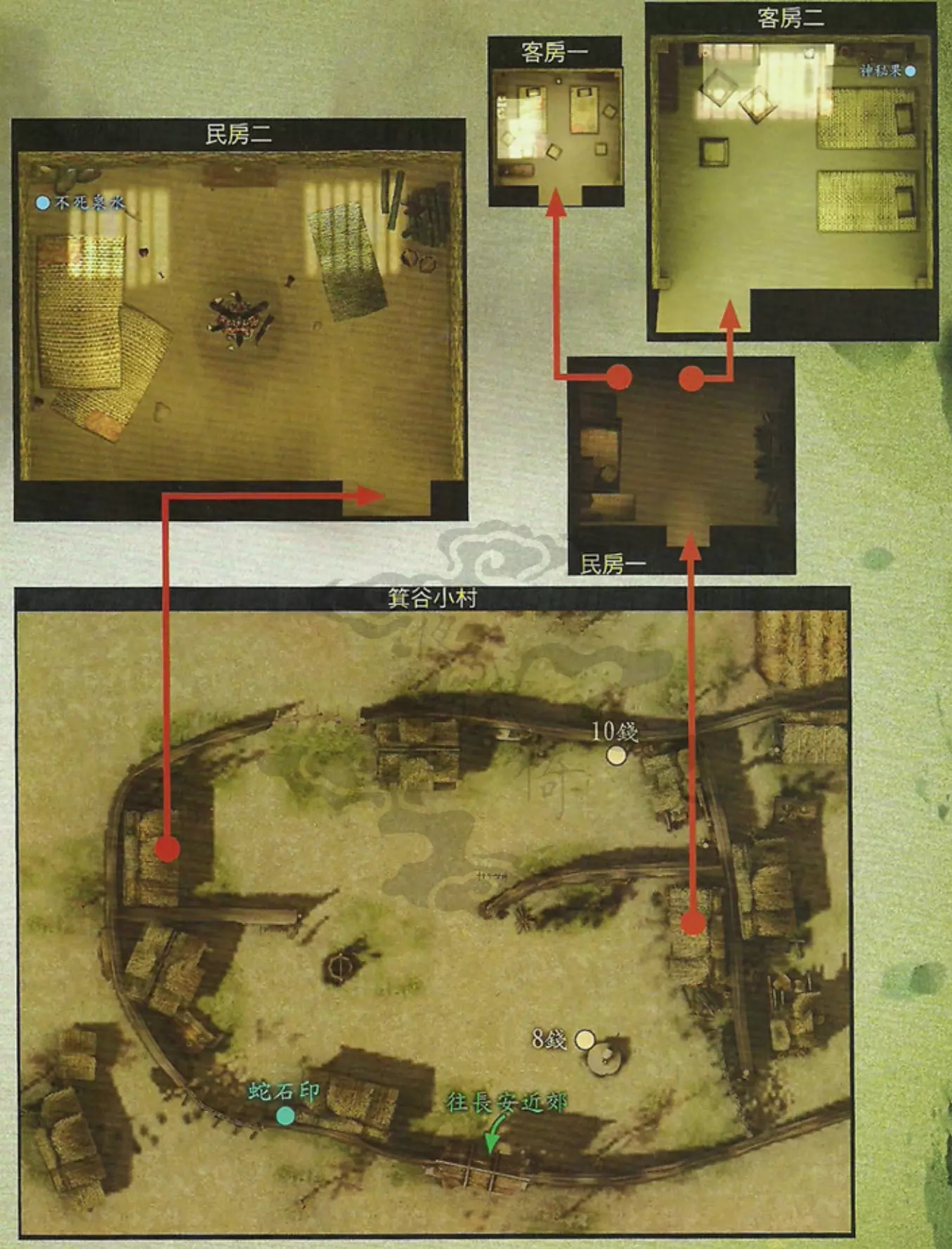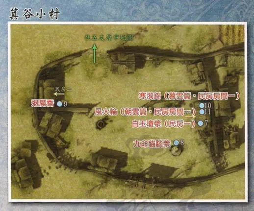 支线任务:找小鸡 触发地点:箕谷村 触发人物:钰娘 任务流程:与钰娘对话答应寻找4只小鸡——找到4只小鸡(具体见下图)——向钰娘汇报 任务奖励:蜂王露,绳索