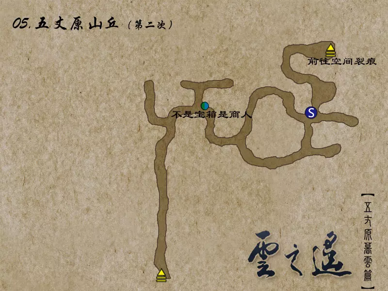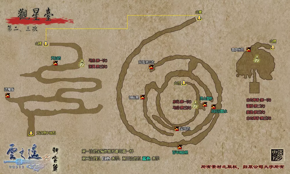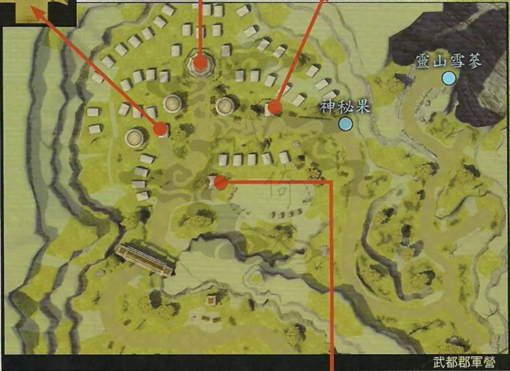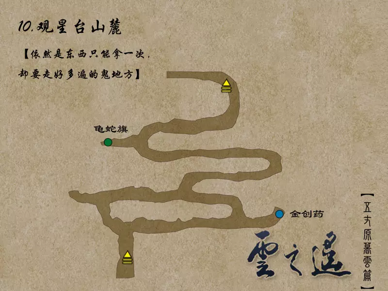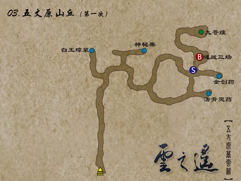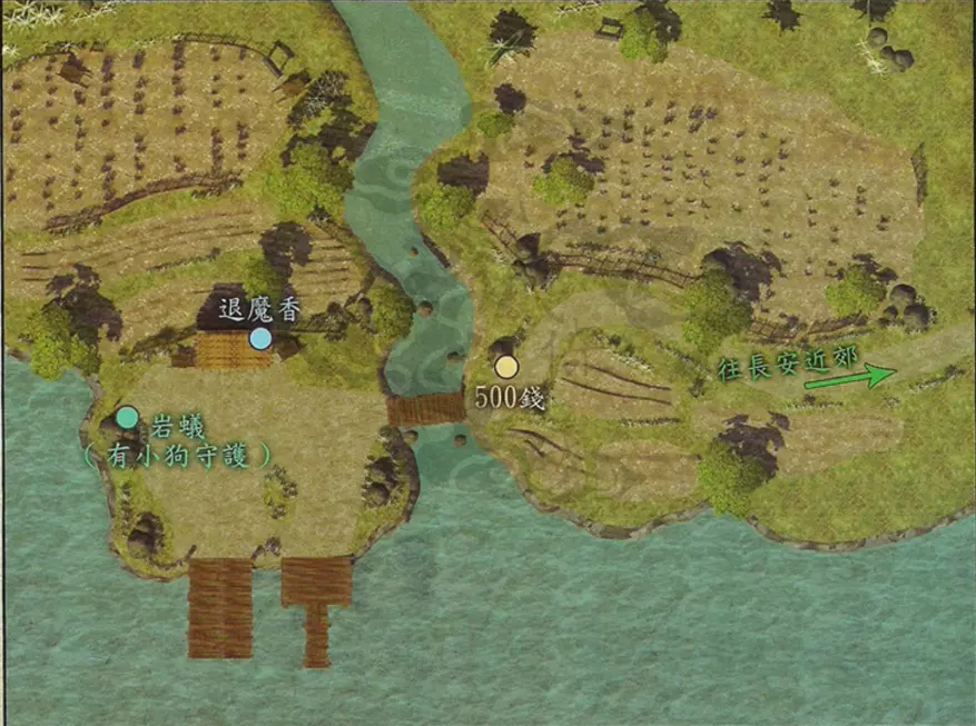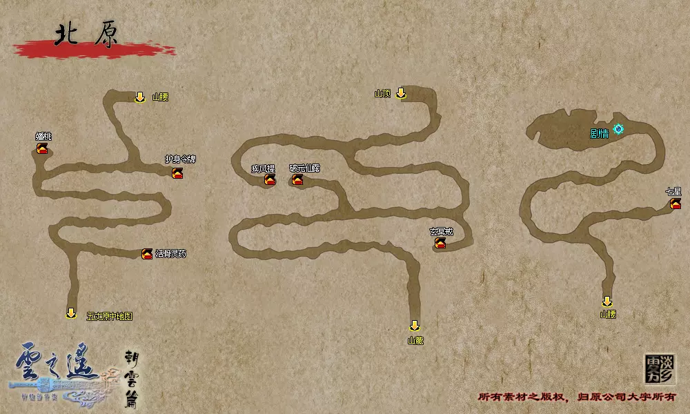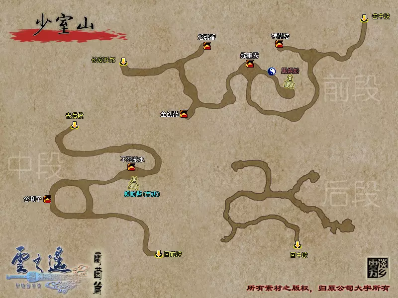 说明:BOSS的生命值低于2/3时会召唤白无常,低于1/3时会召唤黑无常。 夺回宝剑并拾取少室山的全部宝箱后,返回南阳渡口。 【支线任务:山贼的好感度其一】触发地点:北邙山、神乌之岳 任务流程:在北邙山随机战斗触发赤蜈蚣寨战斗事件——在神乌之岳随机战斗触发白蜈蚣寨战斗事件 到南阳渡口与韦迁对话,到达武陵之野,寻找云中界的入口。