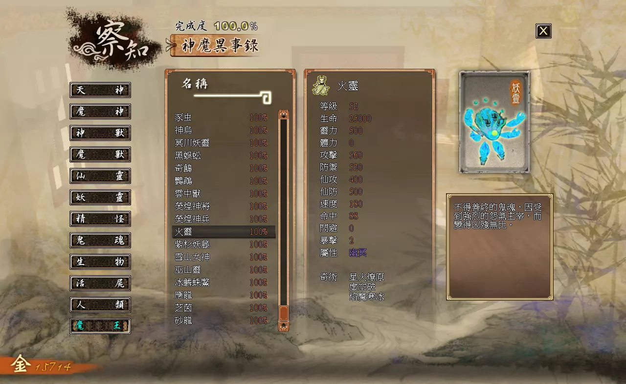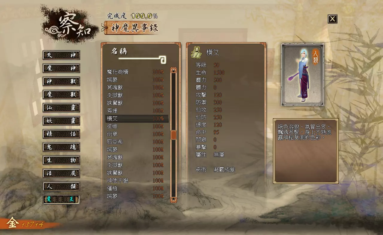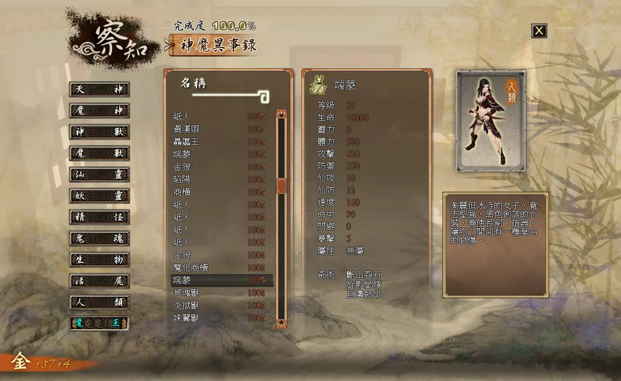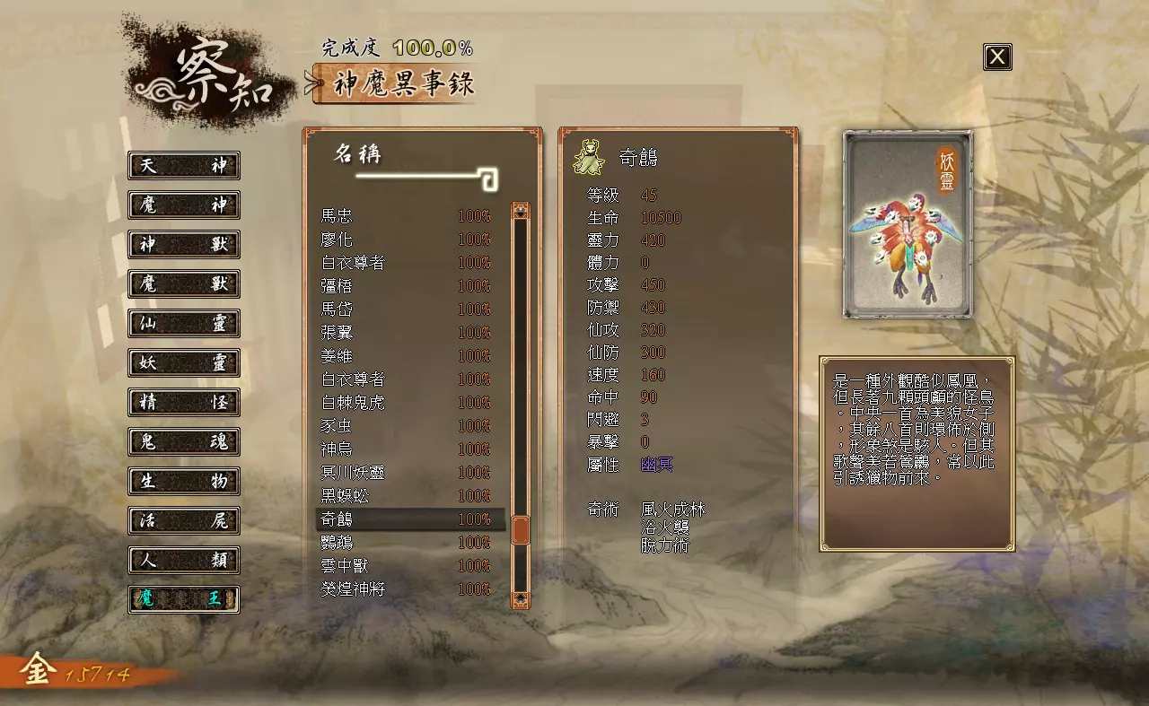 察知界面分为三个模块:【伙伴】【记载】【神魔异事录】。 【伙伴】:查看队伍内角色的详细状态。 【记载】:查看已经接取、完成过的主线与支线任务。 【神魔异事录】:查看辨识过的敌人的资料。 各类数值效果如下: 【等级】:角色当前的等级。 【生命】:角色当前的生命值/角色的生命上限 【灵力】:角色当前的灵力值/角色的灵力上限(武技型伙伴不显示,上限始终为0) 【体力】:角色当前的体力值/角色的体力上限(仙术型伙伴不显示,上限始终为0) 【攻击】:影响角色普通攻击与武技对敌人造成的伤害。 【防御】:影响角色受到的普通攻击与武技的伤害。【仙攻】:影响角色仙术对敌人造成的伤害与回复的生命值。 【防御】:影响角色受到仙术攻击时的伤害减免。 【速度】:影响角色在时间闸内的移动速度。 【命中】:影响角色物理攻击与武技的命中概率。 【闪避】:影响角色躲避物理攻击与武技的概率。 【暴击】:影响角色物理攻击与武技的暴击概率。 【属性】:角色的属性,分为“无”“太阴”“玄阳”“幽冥”四种,由武器决定。 【下一等级所需经验值】:角色升级还需积累的经验值。 神器部分:分为“物品”和“装备”两类。