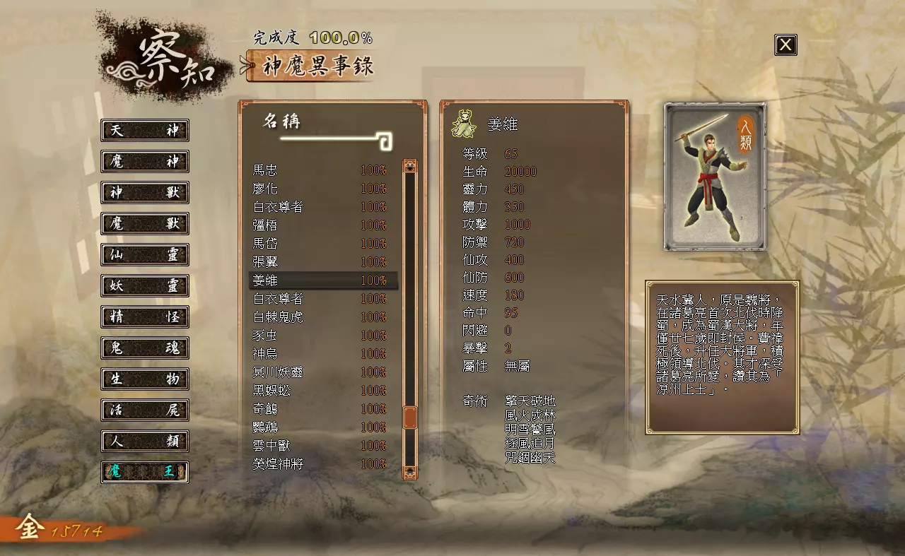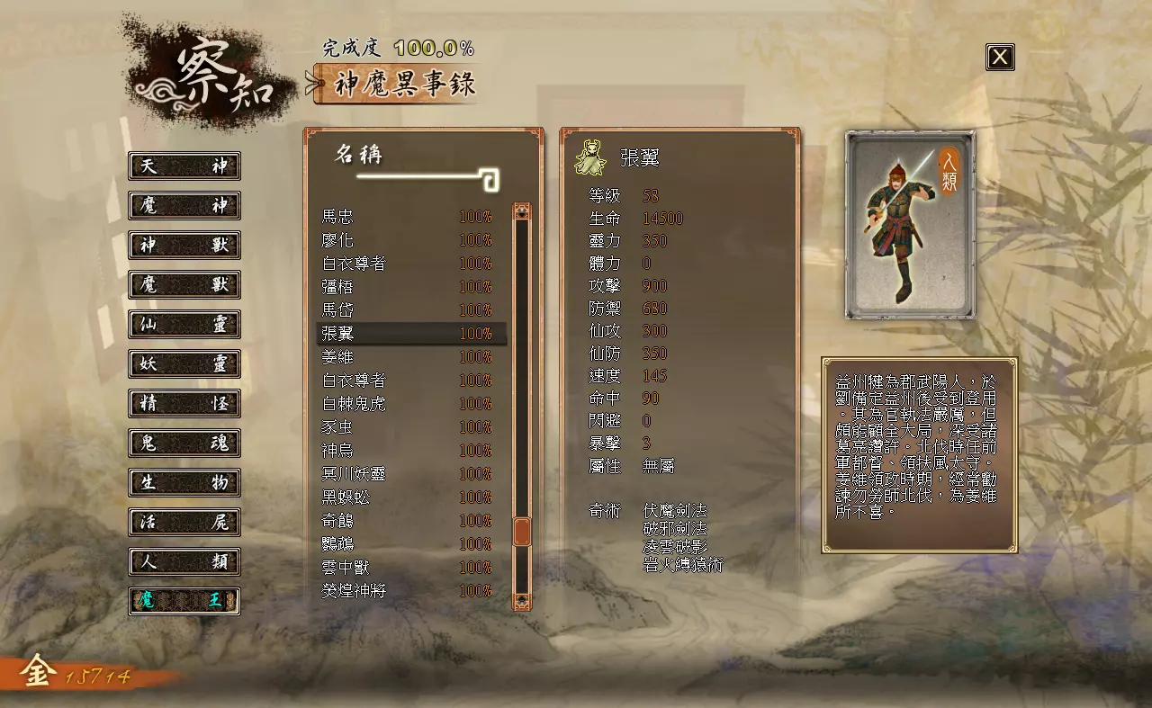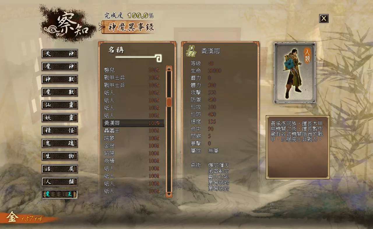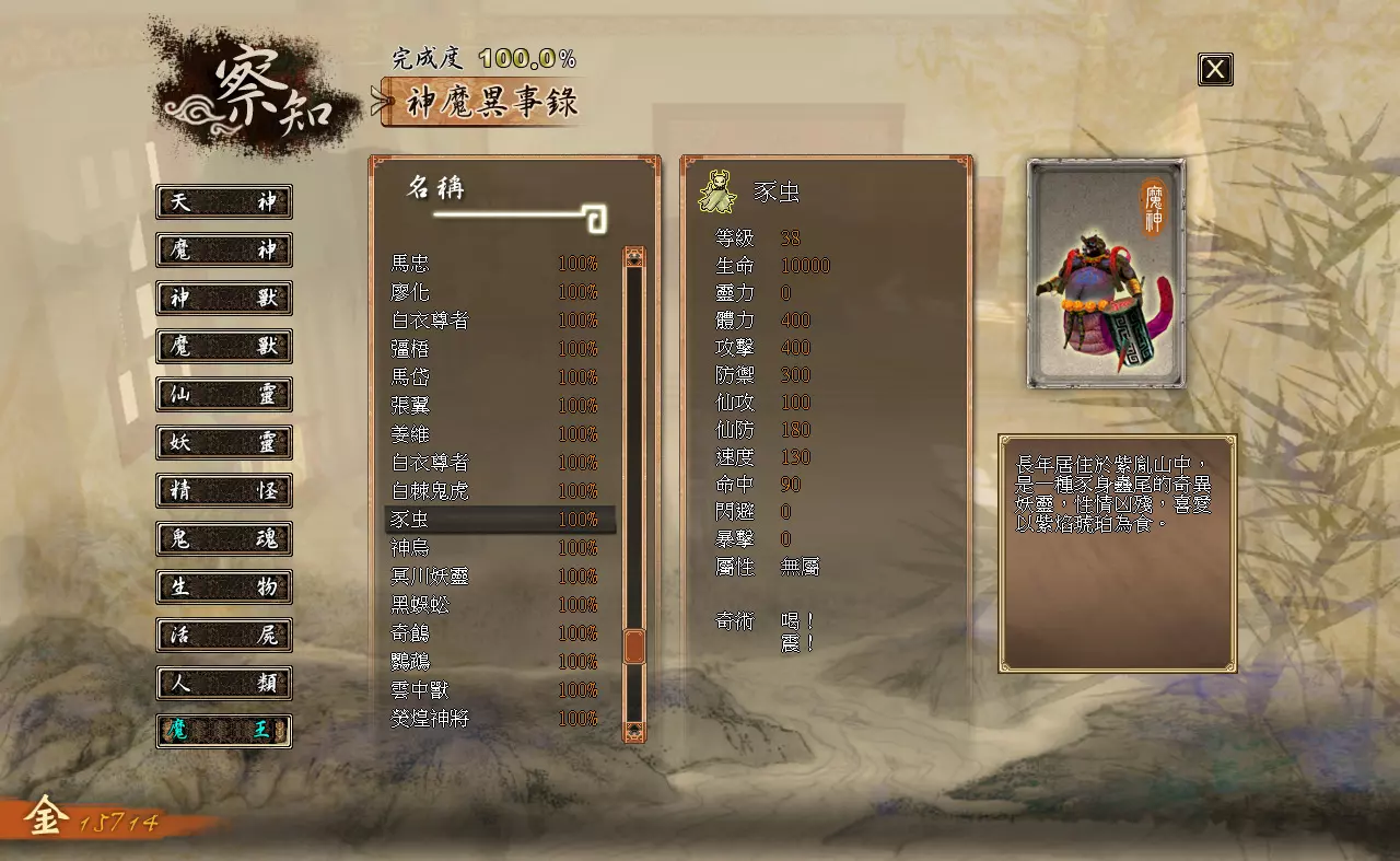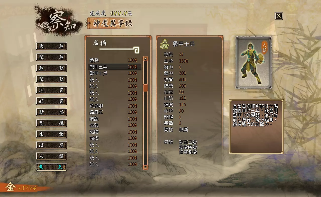 察知界面分为三个模块:【伙伴】【记载】【神魔异事录】。 【伙伴】:查看队伍内角色的详细状态。 【记载】:查看已经接取、完成过的主线与支线任务。 【神魔异事录】:查看辨识过的敌人的资料。 各类数值效果如下: 【等级】:角色当前的等级。 【生命】:角色当前的生命值/角色的生命上限 【灵力】:角色当前的灵力值/角色的灵力上限(武技型伙伴不显示,上限始终为0) 【体力】:角色当前的体力值/角色的体力上限(仙术型伙伴不显示,上限始终为0) 【攻击】:影响角色普通攻击与武技对敌人造成的伤害。 【防御】:影响角色受到的普通攻击与武技的伤害。【仙攻】:影响角色仙术对敌人造成的伤害与回复的生命值。 【防御】:影响角色受到仙术攻击时的伤害减免。 【速度】:影响角色在时间闸内的移动速度。 【命中】:影响角色物理攻击与武技的命中概率。 【闪避】:影响角色躲避物理攻击与武技的概率。 【暴击】:影响角色物理攻击与武技的暴击概率。 【属性】:角色的属性,分为“无”“太阴”“玄阳”“幽冥”四种,由武器决定。 【下一等级所需经验值】:角色升级还需积累的经验值。 神器部分:分为“物品”和“装备”两类。