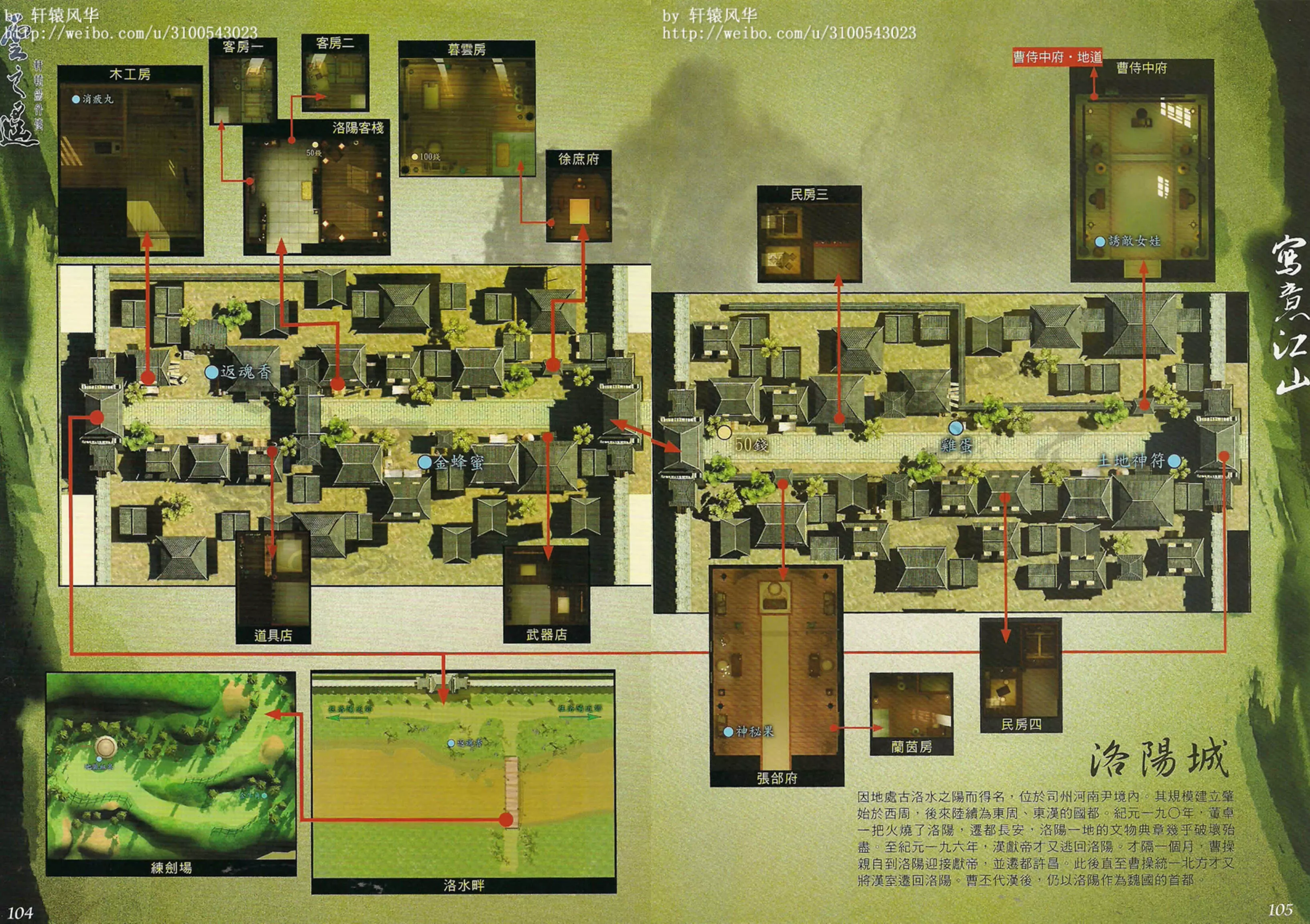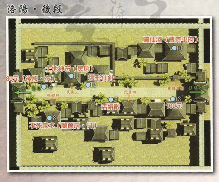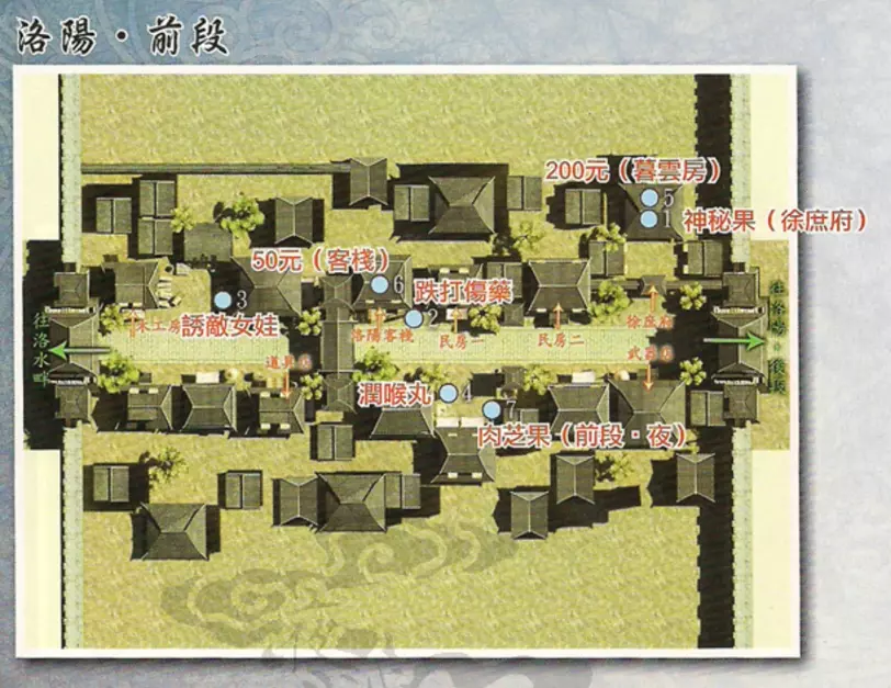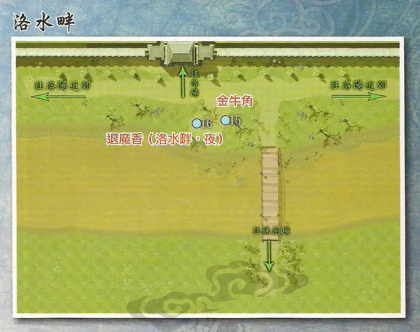 通过密道后见到两个曹叡,曹叡询问徐暮云哪个是真正的曹叡,左右哪个是真的曹叡完全随机,但无论对错都会获得奖励。之后曹叡令徐暮云前往长安绘制秦岭地图,兰茵离队。 返回徐府征得徐庶同意后,前往张郃府寻找兰茵,兰茵、芝茵入队,进入曹侍中府触发BOSS战。 BOSS:久悠+韩龙说明:韩龙的单体斩杀能力强但仙防很低,久悠有群体攻击,建议先集火韩龙再解决久悠。 战斗结束后,久悠、淳于恒入队,前往洛阳西边的长安。◎支线任务:猜字花其二 触发地点:洛阳前段徐府对面 触发人物:碧纹 任务流程:与碧纹对话——〉答案:白头翁 任务奖励:退魔香 特别提示:只有一次机会,答错便无法再答该题 ◎支线任务:心诚则灵!? 触发地点:洛阳前段徐府对面 触发人物:阿权 任务流程:与阿权对话,答应帮忙求卦——〉抽到“宜取洛水” 任务奖励:洞天宝盒/退魔香(已拥有“洞天宝盒”) 特别提示:抽签随机决定,多抽几次一定能完成任务 ◎支线任务:传口信其一 触发地点:洛阳后段 触发人物:裴大娘 任务流程:与裴大娘对话