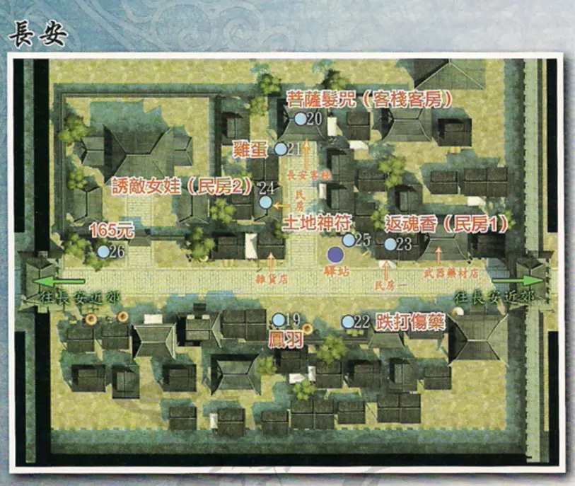到达长安后,进入都督府触发剧情,获得令牌,在长安内寻找向导。与长安百艺团成员对话触发剧情,与莲花一起前往子午谷。◎伙伴支线:淳于恒·阴墓鬼魅其一 触发地点:长安都督府对面 触发人物:李道长 任务流程:与李道长对话得到符咒 特别提示:完成过伙伴支线【古怪神医】方能触发,后续任务虽然可以现在完成,但为了达成特殊结局请务必等玉澧加入后再继续 ◎支线任务:余老头的丰功伟业其一 触发地点:长安街道 触发人物:余老头 任务流程:与余老头对话 ◎支线任务:忙碌的跑堂兄弟 触发地点:长安客栈 触发人物:跑堂 任务流程:与跑堂对话并回答对问题 任务奖励:白玉琼浆 特别提示:问题随机抽取,答案分别是:14(三样都要的客人),4(只要胡豆),18(只要两种),7(只要茴香),8(只要芹菜)◎支线任务:混蛋与云吞 触发地点:长安客栈前 触发人物:大鲁 任务流程:与大鲁对话——与洛阳前段市集老朱对话,得到猪肉——返回长安与大鲁对话 任务奖励:轮回盘 特别提示:完成过支线【胡瓜与虎爹】方能触发 ◎支线任务:三心二意其一 触发地点:长安客栈前 触发人物:砚平 任务流程:与砚平对话——与长安都督府对面的申屠馨对话——与砚平对话 任务奖励:肉芝果 ◎支线任务:三心二意其二 触发地点:洛阳后段 触发人物:苏氏 任务流程:与苏氏对话——与长安都督府对面的申屠老爷对话 特别提示:完成过支线【三心二意其一】方能触发