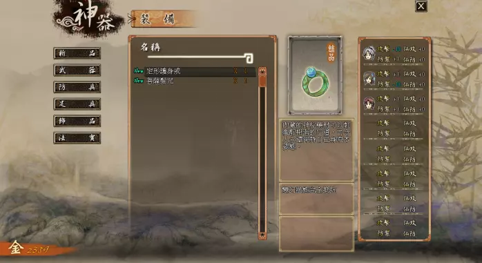在物品界面中,可以查看拥有的物品。其中【新品】是未打开物品界面前获得的物品,【灵药】是回复类道具,【奇物】是辅助类道具,【活物】是收化、炼化或剧情获得的护驾,【其他】是任务物品。物品的详细信息在中间显示,从上到下依次代表物品图鉴、物品介绍、物品作用。 可以使用的物品在选中后按Enter键,再选择使用并选择作用对象即可起效,群体类道具与诱敌女娃无需指定对象,作用于全员。