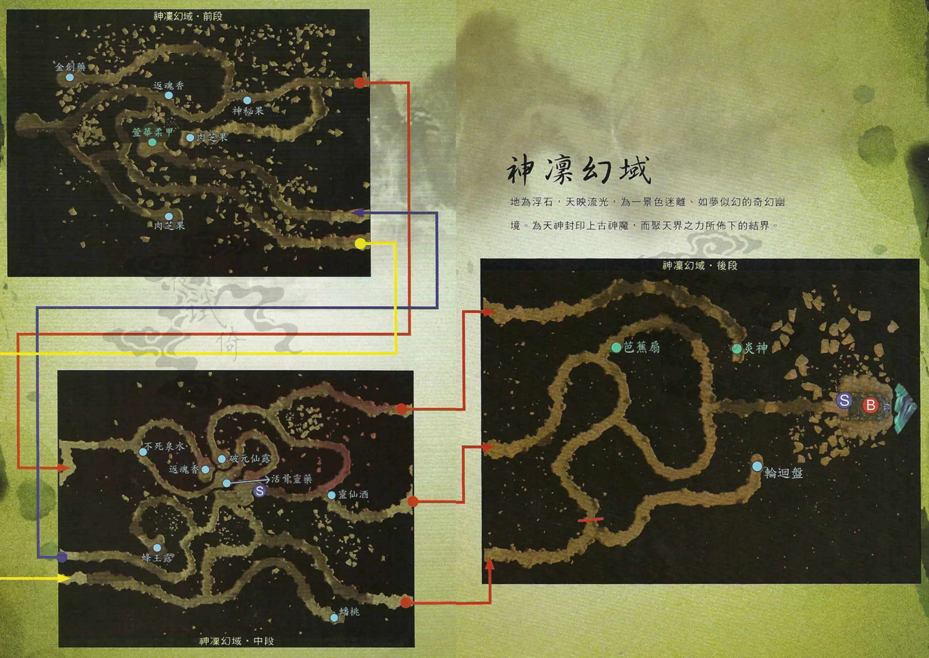 说明:BOSS生命值低于1/2前属性为幽冥,低于1/2后会启动蓄力攻击(优先攻击人数较多的一排),属性转换为玄阳。此战建议兰茵、小黄龙放置于前排物理输出,多鹏放置于后排法术输出与复活。 战胜后触发剧情,古月圣解围,徐暮云、兰茵、久悠到武陵之野找到兰茵。与久悠和芝茵对话后,返回洛阳,芝茵入队。到达洛水畔,芝茵支开久悠与徐暮云,返回张郃府。◎支线任务:重返故里 触发地点:南阳渡口 触发人物:娄桑 任务流程:与娄桑对话 特别提示:该支线在主线自神凛幻域返回后关闭 ◎支线任务:竹马弄青梅其一 触发地点:长安 触发人物:阿花支线任务:老刚的约定 触发地点:黄泉谷入口岔道 触发人物:鬼魂老刚 任务流程: 1. 与阿花对话,选择【理解】,再选择【帮忙】 2. 与都督府士兵、大王小王、客栈前阿祥以及客栈店小二对话 3. 与阿花对话 4. 再次进入长安与阿花和花父对话 5. 再次进入长安与阿花对话 6. 再次进入长安与阿花和孩子对话,选择【帮忙】 7. 与长安客栈店小二对话 8. 与阿祥对话 9. 与都督府旁杨善对话 10. 再次与都督府旁杨善对话 11. 再次进入长安与杨善和阿花对话 12. 与周围乡亲对话 任务奖励:金创药(阿花),仙气返魂香(杨善) 特别提示:该支线在主线到达医巫闾山后关闭任务流程:与鬼魂老刚对话,选择【帮忙】——前往神乌之岳前段点击路旁发光物(具体见地图),触发战斗——前往南阳渡口与赵伙计对话 任务奖励:幽影奇魂 ◎支线任务:遗失的雁形玉 触发地点:洛阳前段 触发人物:萧氏 任务流程:与萧氏对话,选择【帮忙】——与洛阳后段玉商阿日对话——与侍中府卫兵阿唐对话——与洛阳后段梁官对话——与洛阳前段萧氏对话 任务奖励:灵芝 特别提示:该支线在主线曹叡协助离开洛阳前往长安驿站后关闭 回房商议后,二人决定前往神凛幻域尝试盘古斧是否能够劈开荧煌之扉。◎支线任务:传声筒 触发地点:兰茵屋内/武陵之野蛮夷小屋/医巫闾山碉堡房间/应龙圣界 触发人物:绿色传声筒 任务流程:调查传声筒 任务奖励:开启神魔出售以及小黄龙和多鹏的装备出售,此后蛮夷小屋、医巫闾山碉堡房间和应龙圣界中均有此服务,但应龙圣界无法触发多鹏特殊对话 ◎支线任务:姻缘 触发地点:洛水桥上 触发人物:花璃 任务流程:与花璃对话,选择【上前关心】——〉与洛阳后段骆琦对话——〉与洛水桥上花璃和骆琦对话 任务奖励:破元仙露 特别提示:于主线试以盘古斧劈开荧煌之扉前触发本支线可追加兰芝特殊对话,于主线曹叡协助离开洛阳前往长安驿站后关闭支线任务:山贼的好感度其二 触发地点:黄土高地 任务流程: 1. 在黄土高地随机战斗触发黄蜈蚣寨战斗事件 2. 前往少室山中段碉堡处与蜈蚣帮众对话,触发战斗 3. 前往侍中府与韩龙对话 任务奖励:少室山马夫系统开启,黄土高地马夫系统开启(自神凛幻域返回洛阳后再前往黄土高地才有系统开启提示),木门道马夫系统开启(自木门道返回洛阳后再前往木门道才有系统开启提示) 特别提示:三色蜈蚣寨事件触发没有先后顺序,该支线在主线再次前往幽冥地界寻找后土娘娘关闭