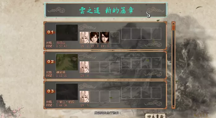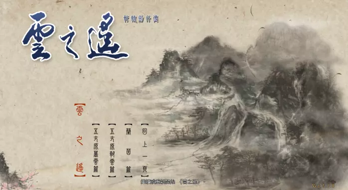【云之遥】:本篇,记叙了徐暮云在少年时期的历险故事。 【五丈原暮云篇】:资料片,记叙了徐暮云成为白衣尊者后奉命保护诸葛亮的故事。 【五丈原朝云篇】:资料片,补充了汉之云后期的剧情,与暮云篇是两个平行世界的故事。 【兰茵篇】:资料片,记叙了本篇结束半年后,兰茵的真实身份揭晓,并踏上拯救暮云之旅的故事。 故事时间顺序为:云之遥→兰茵篇→五丈原篇,建议以“云之遥→兰茵篇→五丈原暮云篇→五丈原朝云篇”的顺序进行游戏。 另外,按照云之遥→兰茵篇→五丈原篇的顺序进行游戏时,这三个篇章的游戏时间会按照故事顺序继承。而五丈原朝云篇的游戏时间是单独计算的。 选择一个篇章后,选择【新的篇章】即可新开游戏,新的篇章下方是存储的档案。