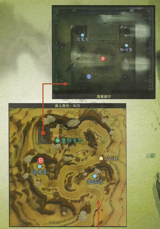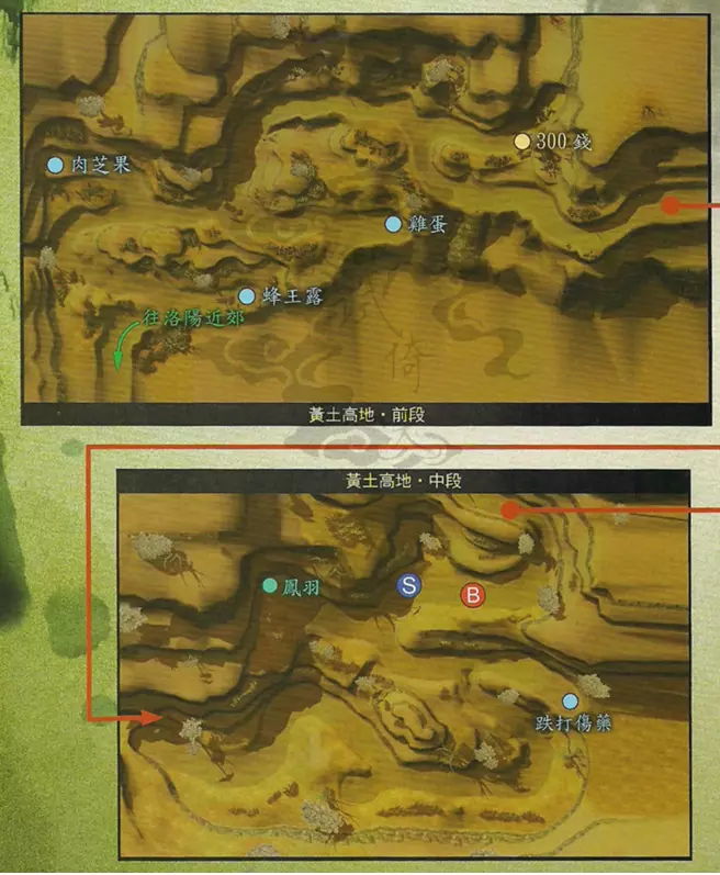 到达少室山后段后,前进触发剧情,暮云单独寻找兰茵。找到兰茵后继续前进,在松树处点击宝箱触发剧情,进入BOSS战。 BOSS:虎 说明:此战可以让徐暮云全力攻击,兰茵和张诰保存实力,因为接下来剧情后的BOSS战中徐暮云将无法造成正常伤害! 战胜后返回松树下打开宝箱(此宝箱无法拆成木材),触发BOSS战。 BOSS:金狼 说明:徐暮云的普通攻击、技能攻击以及绝技攻击对金狼只能造成1点伤害值。建议将暮云放在后排保持防御状态,只使用【破势杀阵】和道具回复。 战胜后继续剧情,将张诰送回张郃府后返回徐府,张诰、兰茵离队。前往洛水畔与曹侍中对话,返回徐府后久悠入队,【镜界系统】开启。前往张郃府寻找兰茵,兰茵入队。此时有两个支线任务可以完成。 小纸条:久悠可以使用技能【辨识】,增加敌人在【神魔异事录】15%的辨识度,辨识度达到100%时非BOSS类敌人可以消耗金钱召唤。另外,辨识时会对敌人进行攻击,因此也可以适时按下鼠标左键触发属性克制的追击(但是没有提示),最新的离线版辨识触发的追击只会造成1点伤害,但依旧可以触发对应的异常BUFF。◎支线任务:瘸腿老头 触发地点:洛阳前段木工房工地旁 触发人物:瘸腿老头 任务流程:与瘸腿老头对话,选择帮忙——〉给予布鞋,选择帮忙——〉给予消疲丸,选择帮忙——〉给予防毒香包 任务奖励:定形护身戒 特别提示:完成任务后再与其对话可得知瘸腿老头的往事 ◎支线任务:驱鬼的方法 触发地点:洛阳后段民房三 触发人物:姚家四口 任务流程:与姚家四口对话——〉洛水畔与姚二郎对话——〉给予还形仙针 任务奖励:菩萨发咒 支线任务完成后,开始寻找与曹侍中相似的木工,与洛阳前段的向承对话可获得3个线索,接下来有三个选择: 1.找花老爷询问(关闭支线【习府少爷】,支线【三途归冥】判定为优) 2.找习老爷询问(开启支线【习府少爷】,支线【三途归冥】判定为劣) 3.直接去木工房(关闭支线【习府少爷】,支线【三途归冥】判定为劣) 由于支线【习府少爷】并不会影响对应支线伙伴娄桑的结局,而支线【三途归冥】判定为优会使淳于恒的最强武器额外获得生命值加成,建议选择选项1。 选项1: 前往洛阳后段与花老爷对话后,前往客栈与管家对话,再前往木工房与工人对话。与工人对话后,前往洛阳后段民房四寻找狗子,得知狗子与阿旋前往北邙山。选项2: 在洛阳前段民房一中与三名木匠对话(此时与习嘉对话,选择帮忙开启支线【习府少爷】),与向承对话后前往木工房,得知木工师傅前去客栈。前往客栈寻找木工师傅,得知其返回木工房。(此时与管轼对话后,再返回民房与习嘉对话,完成支线【习府少爷】并获得宣花斧)前往木工房与木工师傅对话后,于洛阳前段民房二王十处得知阿旋与狗子前往北邙山。 选项3: 前往木工房与工人对话后,前往客栈寻找木工师傅,得知其返回木工房,前往木工房与木工师傅对话后,于洛阳前段民房二王十处得知阿旋与狗子前往北邙山。在北邙山顶找到狗子与淳于恒,触发剧情战【硥】,战后继续剧情,众人返回洛阳。 返回洛阳后,与狗子(选择线索1)/木工师傅(选择线索2)/王十(选择线索3)对话后得知阿旋前往铜雀台,前往邺城西侧的铜雀台工地与阿旋对话,将他带到洛阳后段的曹侍中府后返回徐府休息。久悠、兰茵离队。 休息完后前往张郃府兰茵房与兰茵对话,兰茵入队,前往练剑场寻找张郃。 支线任务:化龙转生其一 触发地点:洛阳前段民房二 触发人物:羊儿 任务流程:与羊儿对话——与洛水畔的小球儿对话(过桥即可看见) 在练剑场与张郃对话后,返回徐府触发剧情,久悠入队,前往并西黄土高地。伙伴支线:淳于恒·古怪神医 触发地点:少室山前段 触发人物:淳于恒 任务流程:于少室山遇见晕倒的淳于恒与山贼和女剑客,发生战斗,淳于恒被带回洛阳——〉选择1、立刻回洛阳探视——〉前往洛阳前段民房二探视淳于恒——〉在黄土高地前段找到淳于恒,触发剧情战——〉返回洛阳前段民房二——〉与乔大叔对话 任务奖励:不死泉水,淳于恒入队 特别提示:选择2、下次返回洛阳时再去探视则无法获取不死泉水