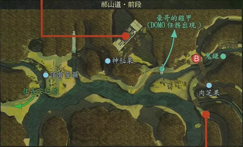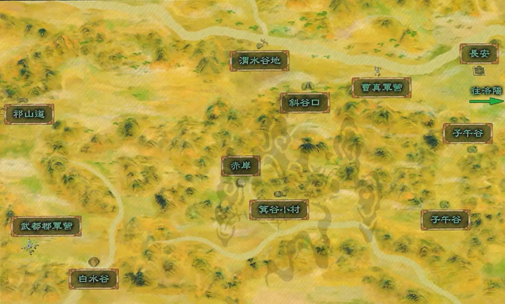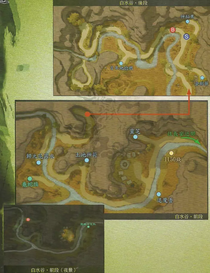 说明:太阴属性攻击会使得头目生命值全满。 绘制好祁山道地图后,到长安都督府交还令牌,然后返回洛阳。【伙伴支线:娄桑·追查真凶】 触发地点:长安客栈 触发人物:百戏团成员 任务流程:与百戏团成员对话——在长安市集空地处与莲花和掌柜对话——与长安街道彭老伯对话——返回长安客栈与莲花对话——前往子午谷在高处触发青冥与裘暖对话,进入战斗——返回客栈与莲花对话 任务奖励:平安符 【支线任务:小豆子猜谜其一】 触发地点:长安城门旁 触发人物:小红与小豆子 任务流程:与小红、小豆子对话——回答“耳朵” 任务奖励:神秘果 【支线任务:余老头的丰功伟业其二】 触发地点:长安街道 触发人物:余老头 任务流程:与余老头对话支线任务:长安贵公子 触发地点:长安都督府旁 触发人物:娄彦、泼皮、阿忠 任务流程:与娄彦三人对话——前往子午谷(中段岔道处)与泼皮战斗——将银纹凋月交还娄彦 任务奖励:灵山雪参 特别提示:绘制完地图后初次返回长安后无法触发,必须再次进入长安场景方能触发 支线任务:箕谷小村 触发地点:子午谷绘图高地 触发人物:子午谷断桥 任务流程:以5份木材修复断桥 任务奖励:可通过另一出口前往箕谷村