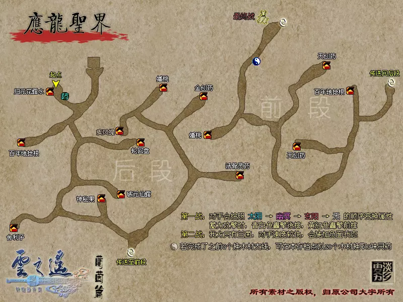 ◎支线任务:存档点与木材 触发地点:应龙圣界前段出口 触发人物:存档点 任务流程:调查存档点,给予20份木材 任务奖励:灵山雪参,九命猫脑浆,轮回盘 特别提示:完成过支线【百姓与木材】方能触发 到达应龙圣界出口时触发剧情,进入BOSS战。 ◎BOSS:应龙