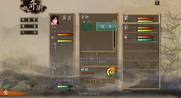 在奇术界面内,选定角色后可以查看与使用角色的技能,其中绿色的技能是可以使用的,使用方法与使用物品相同。中间栏显示的内容分别为技能列表、技能介绍、绝技介绍。 镜界部分: