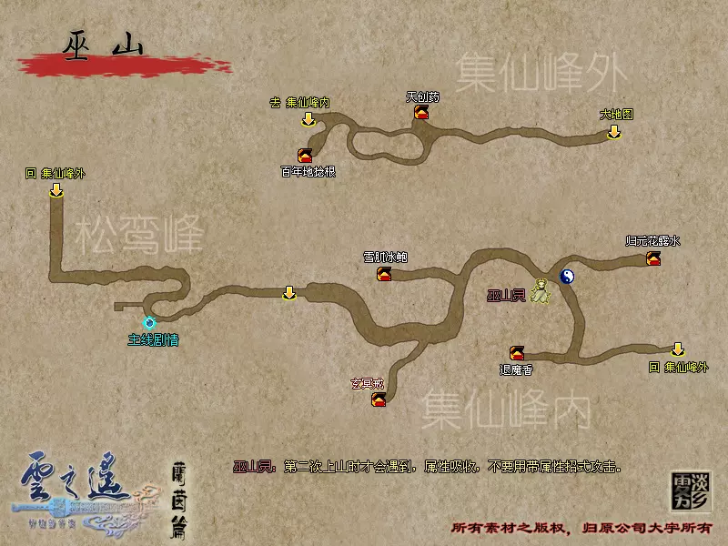在巫山行进途中遇见巫山仙子,兰茵被传送回山脚,再次前进,回到松峦峰触发BOSS战。 BOSS:巫山灵