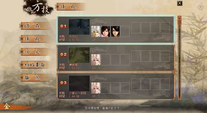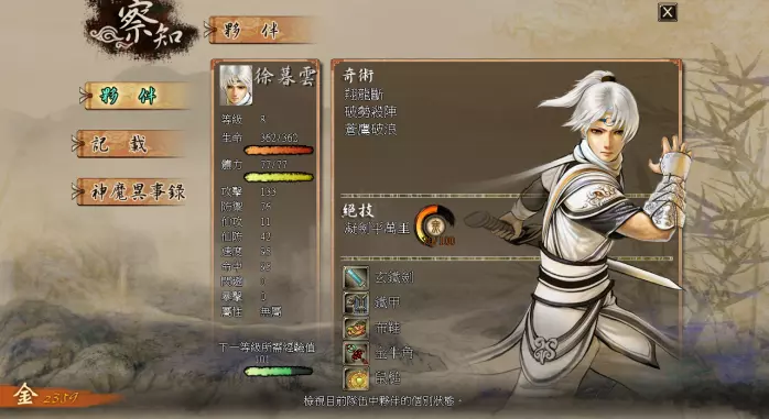 在剧情结束后的自由行动流程中,游戏的界面如上图所示。其中,左上方是小地图,小地图上的两个按钮分别代表:是否半透明化、关闭小地图。 《轩辕剑外传:云之遥》可进行的基本键盘操作有: WASD或方向键:移动 Enter键:进入菜单/选定 Esc键或Ctrl键:回到上级菜单/取消 P键:截图 Space键:对话 当然,大部分按键都能用鼠标代替。其中,点击右上角的小卷轴为进入主选单,按住左键为往该方向移动,点击鼠标右键为取消。 主选单说明:进入主选单后,可以看到队伍内角色的状态与金钱数,《轩辕剑外传:云之遥》的主选单分为七个部分:【察知】【神器】【整备】【奇术】【镜界】【行伍】【方技】