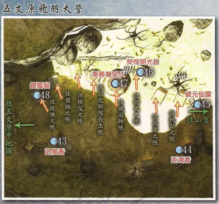战胜后强梧自尽,羽之部返回飞羽大营,焉逢与赵云交谈后决定再次行刺。此时飞羽大营中各个营帐的宝箱开启,可以拾取。