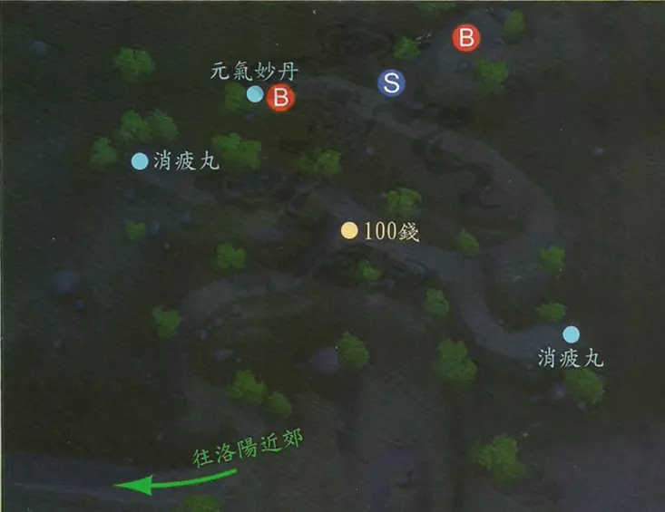 小纸条:与前作一样,本作的宝箱可以调查数次以后拆成木材。◎支线任务:洛阳掌柜的好感度 触发地点:洛阳客栈 触发人物:客栈老板 任务流程:休息10次,开启洛阳驿站 任务奖励:开启洛阳近郊驿站,可免费前往北邙山、少室山、南阳渡口、铜雀台工地、黄土高地、长安 特别提示:一次500钱,早期是付不起这个钱的,之后金钱充足再做不迟 ◎支线任务:投壶游戏 触发地点:洛阳客栈 触发人物:于公子(坐在客栈右边) 任务流程:对话即可加入游戏,一次10钱 任务奖励:按照投中情况依次获得不同奖励金钱,从10钱到500钱不等 特别提示:可无限次触发,虽然本金都能收回来,不过把时间浪费在这里实在不值当在离开洛阳时触发剧情,兰茵入队,此时可以进入洛阳后段完成部分支线。◎支线任务:刺探敌情 触发地点:洛阳前段 触发人物:老杨 任务流程:与老杨对话,得到50钱——〉洛阳后段,向阿楚买茶失去50钱——〉洛阳前段,向老杨汇报——〉洛阳后段,与茶铺旁的两名茶客对话——〉洛阳前段,向老杨汇报 任务奖励:元气妙丹,跌打伤药 ◎支线任务:街角的乞丐 触发地点:洛阳前段 触发人物:小萝卜等四个孩童 任务流程:与孩童群对话——〉洛阳后段,与街角乞丐对话,选择闲聊——〉洛阳前段,向孩童汇报 任务奖励:元气妙丹 特别提示:本支线需兰茵在战斗队列才可完成小纸条:《轩辕剑外传 云之遥》的各类支线触发都只会检测战斗队列中的角色(即查知中的前四位),所以如果想触发对应角色的支线剧情,务必先将他们放在战斗队列。支线伙伴的对应支线除韩龙外都有或多或少的交集,如果嫌麻烦可以在触发前将所有支线伙伴放入战斗队列。 支线完成后,前往洛水之畔南侧的练剑场。与张诰对话后,张诰入队,前往洛阳北方的北邙山。