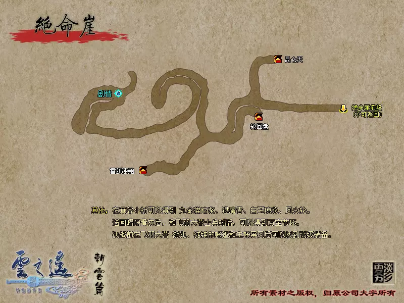 说明:可以利用之前收集的【灼热焰冰】降低头目的生命,灼热焰冰共有5份,按照使用数量头目生命降低数值有所不同。 战胜后继续前进来到幽冥地界,与后土娘娘对话后得知归元之瞳的制作方法,兰茵决定返回洛阳与芝茵协商。支线任务:仙芝情缘番外篇 触发地点:幽冥地界入口 触发人物:云芝 任务流程:与云芝对话——前往桃源仙界取得【杨枝露水】(具体位置见之前的地图标记)——前往黄泉谷冥川上方高地处与火灵程先对话,触发战斗(此战火灵程先为玄阳属性)——前往幽冥地界与云芝和程先对话 任务奖励:华胥金风(战斗获得),天女丝巾 回到张郃府房内与芝茵交谈,芝茵叫出应龙,应龙拒绝兰茵的提议,并让二人明日动手控制徐暮云。前往徐府与徐安对话,得知徐暮云外出,芝茵让兰茵独自休息,兰茵则前往曹侍中府寻求帮助。与曹叡交谈后,曹叡帮助兰茵离开洛阳,兰茵前往长安市集中心的驿站,并从此进入医巫闾山碉堡。