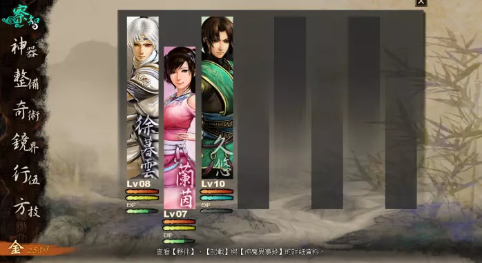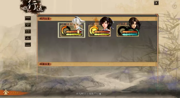 在行伍界面内,可以更换角色的位置。选择任一角色后再选择另一个位置,即可将两个位置的伙伴交换顺序。(若其中一个是空位则该角色移动至空位) 另外,《轩辕剑外传:云之遥》的行伍中没有前后排之分,只有【战斗队列】与【预备队列】。战斗队列分前排与后排,位于后排的角色攻击力降低、防御力升高,前排角色数量越多,这种效果越明显,若所有队员都在后排则无效果。 注意: 1. 预备队列的伙伴无法在任务中辨识,在完成相关伙伴任务时请务必将对应角色放置至战斗队列。 2. 预备队列的伙伴战斗所获经验减半,无法获得法宝经验。 方技部分: