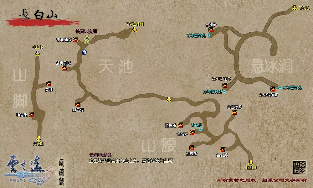 到达长白山深处后触发剧情,进入BOSS战。 BOSS:雪山女神
