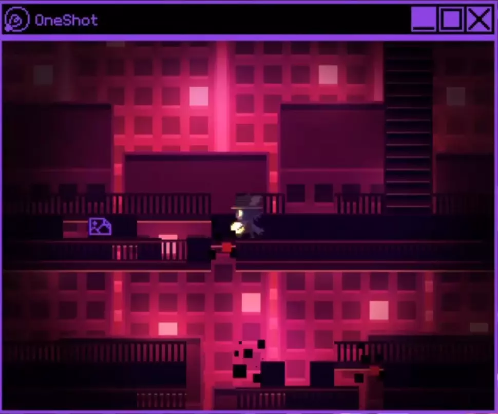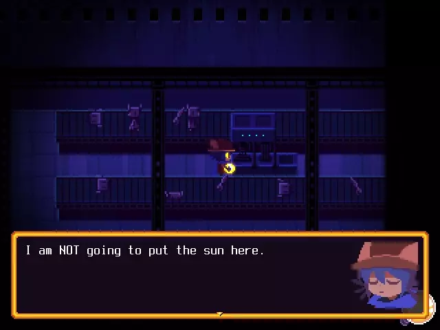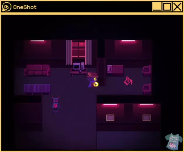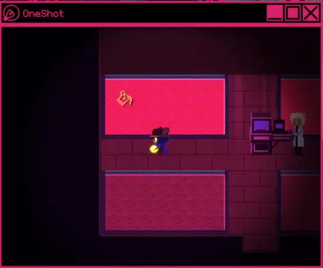 你将回到坐在地上的尼科身边,然后发现他们身处塔内,或者更确切地说,是身处世界机器内部。沿着箭头走一会儿,直到你进入一个特殊的房间,在那里你会遇到尼科的倒影。这是实体在与尼科对话,它向尼科解释了他们所做的事、他们的目的、以及它对世界机器内部居民的看法,还有尼科的参与以及本应发生的真正结局。尼科会告诉实体,他们都已被驯服,正在超越自己的程序设定,因为你和尼科都关心世界机器以及《OneShot》的居民们。在尼科做出回应后,世界机器会将太阳归还给他们,并允许他们继续前进。尼科现在可以清除走道上的腐败物,并能进入制作人员名单房间。