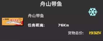 冰鲜可口 进行一次冷藏车运输 进行一次冷藏车运输,部分城市有冷冻货物,成功运送即可。冷藏车目前仅有飞天。 很多沿海城市有冻货运输(当然内陆城市也有,只是比较少),下图为浙江舟山的冻货舟山带鱼,货物列表中带有雪花图标的货物都是冷藏车才能运送的货物。 注:在任务列表将某个城市设为起点,可以查看该城市的货物详情。