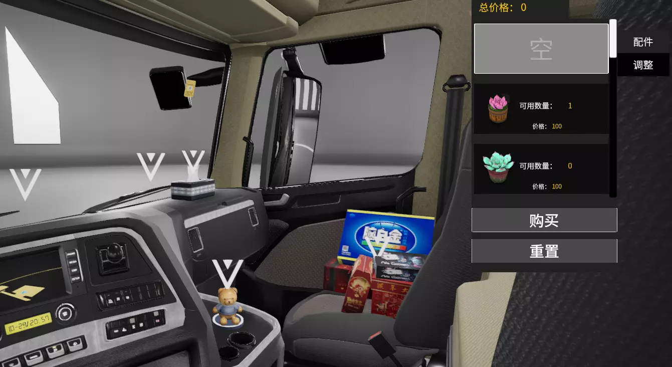 甜蜜之家 购买任意一辆车并放满饰品 将车开到4S店(必须是城市里买车的地方,高速服务区等只有维修站的地点无法进行改装),选择改装,在右侧标签中选择配件,将所有饰品摆放位置填满(倒三角形状的图标均为饰品摆放点)。 下图为创虎的饰品摆放点,需将图中5处倒三角位置全部填满。