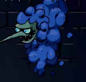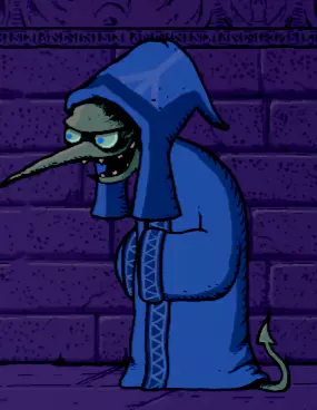 他穿着类似蓝色斗篷的东西,我们看不到他的手,它们藏在斗篷下面。他的皮肤颜色是淡绿色,眼睛是蓝色的,还有一个长长的尖鼻子(就像蚊子的一样)。他有一条像恶魔一样的尾巴。这就是他通常的样子。