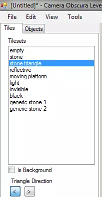 当绘制【三角形】 tileset 时,工具栏中会出现一个名为【三角形方向】的额外控件。此控件用于控制你所绘制三角形的指向方向。编辑器会根据周围的几何形状自动确定三角形应有的形状。 此外,还有一个标有【Is Background】的复选框。若勾选此框,你绘制的 tiles 将作为背景 tiles 绘制——它们会更暗且不可交互。你可以将其用于装饰目的。在游戏中,背景 tiles 会自动在相邻的实体 tiles 后方延伸,以填充这些 tiles 中任何透明部分的后方区域。 部分物体允许你为它们绘制形状。如果你选中了这类物体之一,你将直接在该物体上绘制,而非在地图上。下一部分将详细介绍。 物体 即使不使用移动平台和发光地砖等额外地图元素,也能制作出许多有趣的地图,但这些元素仍可用于创造更多挑战。