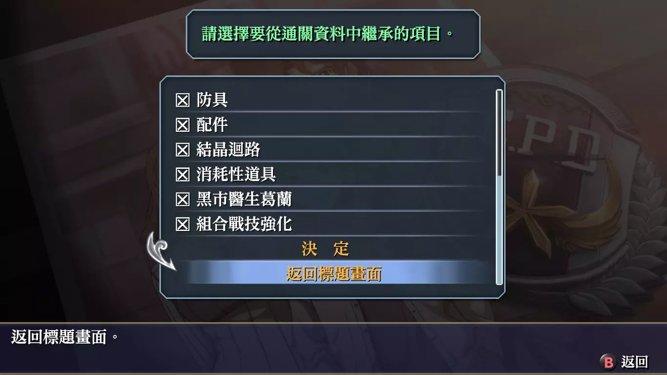 也就是说,在一周目通关以后,玩家重新开始游戏的时候,可以保留几乎之前所有的收集品、以及能力,并且能够自由选择是否保留某些特定的数据。这使得二周目以后游玩变得非常简单。因此,推荐按照以下流程完成本作的攻略:周目开局获取成就累计PT一简单(或普通)难度
