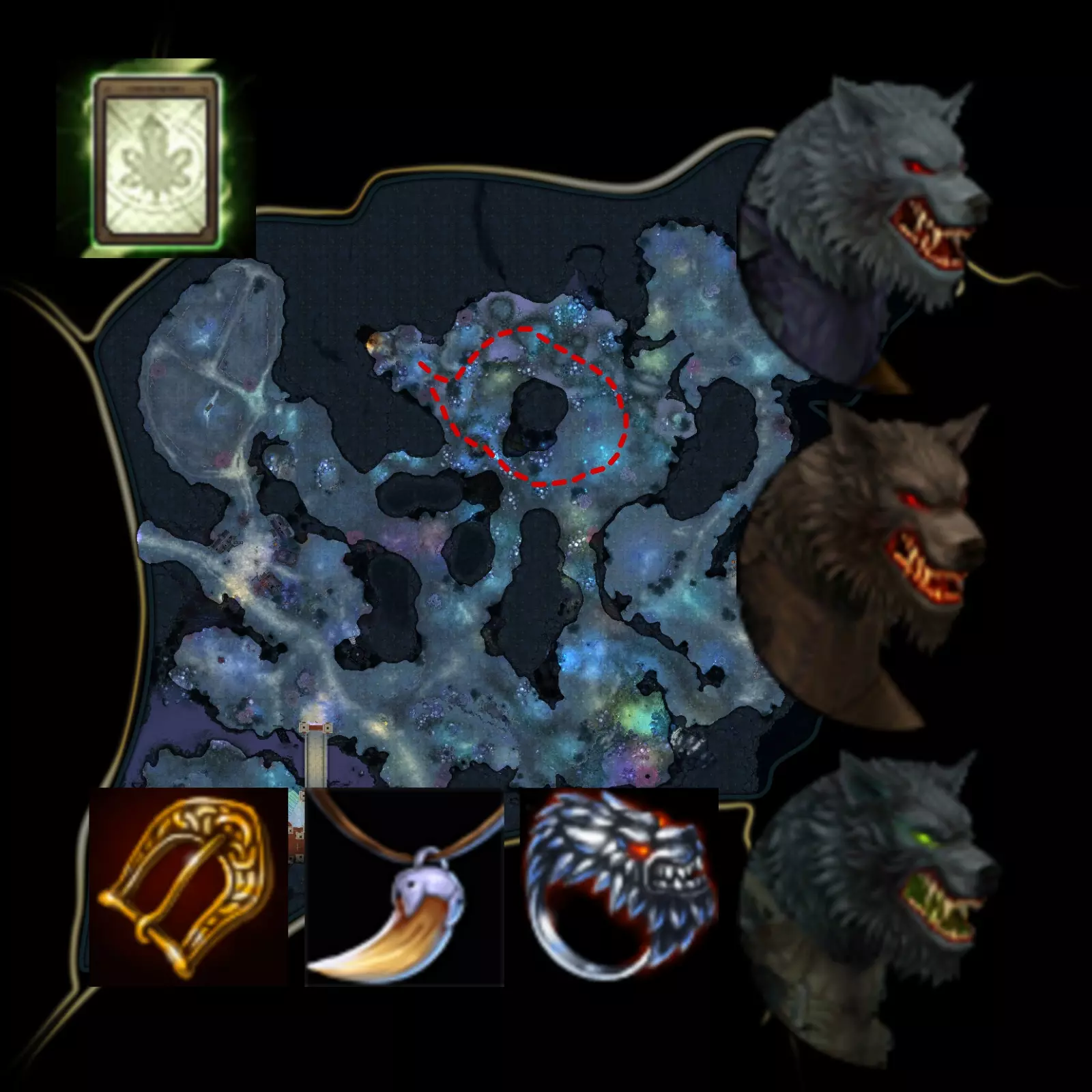 铁宝箱、黄金宝箱、水晶宝箱、紫晶宝箱——需要对应钥匙。 狼之陶罐——一种花瓶,内含三十级装备和消耗品。 被诅咒的宝箱——可从中获得四十级和五十级的装备与消耗品,能带来额外收益。与地点相关的任务: 该地点有NPC加布里埃尔,他的任务会要求收集50份绿色草药、获取10个堕落战士的代币(任务物品需在接取任务后获得),以及点燃榛树枝。 此外,玩家会在沃尔拉克斯的NPC兹比赫发布的“废弃地窖”任务指引下,前往狼穴收集酒桶。 可简化刷取过程的物品: 这部分包含两种物品。能够提升角色移动速度的物品,以及能够带来额外收益的物品。 前者包括:各种跑鞋、带有【+%移动速度】魔法印记的装备、如【草药口香糖】【寻宝者药剂】之类的消耗品。 后者包括:带有托萨地图(或类似地图)的手套、带有母钳嘴兽地图的 artifact。地图:博格莫拉、托萨、风角托萨、感染托萨、魅惑托萨、斯特雷科斯卡帕、北方钳咬兽。 可能遇到的难点: 主要难点可能是阿尔法雄性——这个精英怪物应该被忽略并绕开。玩家不会去刷它,所以它很可能会一直出现在地图上。在首领中值得注意的是莫里乌斯——如果它被船帆强化,在刷怪时也可能成为一个大麻烦。对付它要小心。祝大家刷怪顺利!