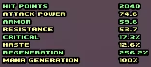生命值 - 最大生命值 攻击力 - 造成的伤害 护甲 - 护甲,抵御物理伤害(近战、弓、弩、回旋镖) 抗性 - 魔法抗性 暴击 - 造成暴击伤害的几率 急速 - 攻击速度 生命恢复 - 恢复,准确来说是通过消耗品恢复生命值的速度 法力恢复 - 法力恢复或获取 对应等级的怪物可能会掉落对应等级的装备以及遗骸(剩余物)对应等级。剩余物可以在城里找鉴定师鉴定,以获得随机物品。