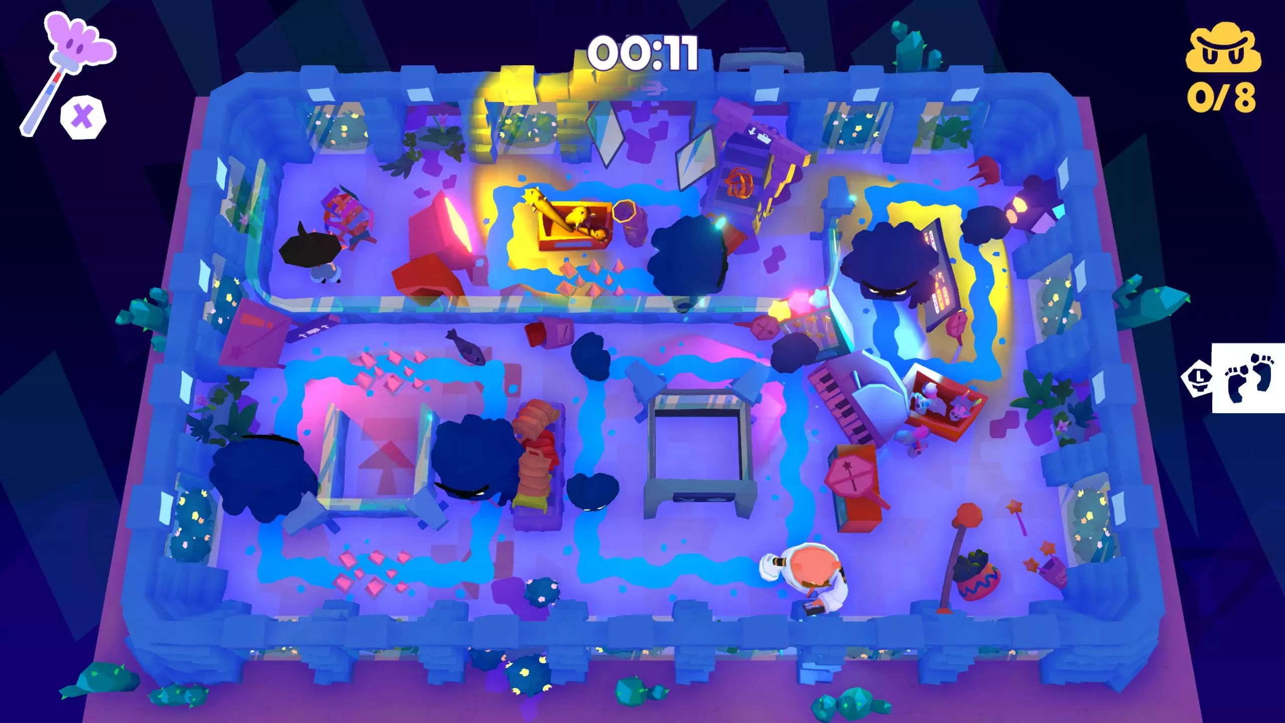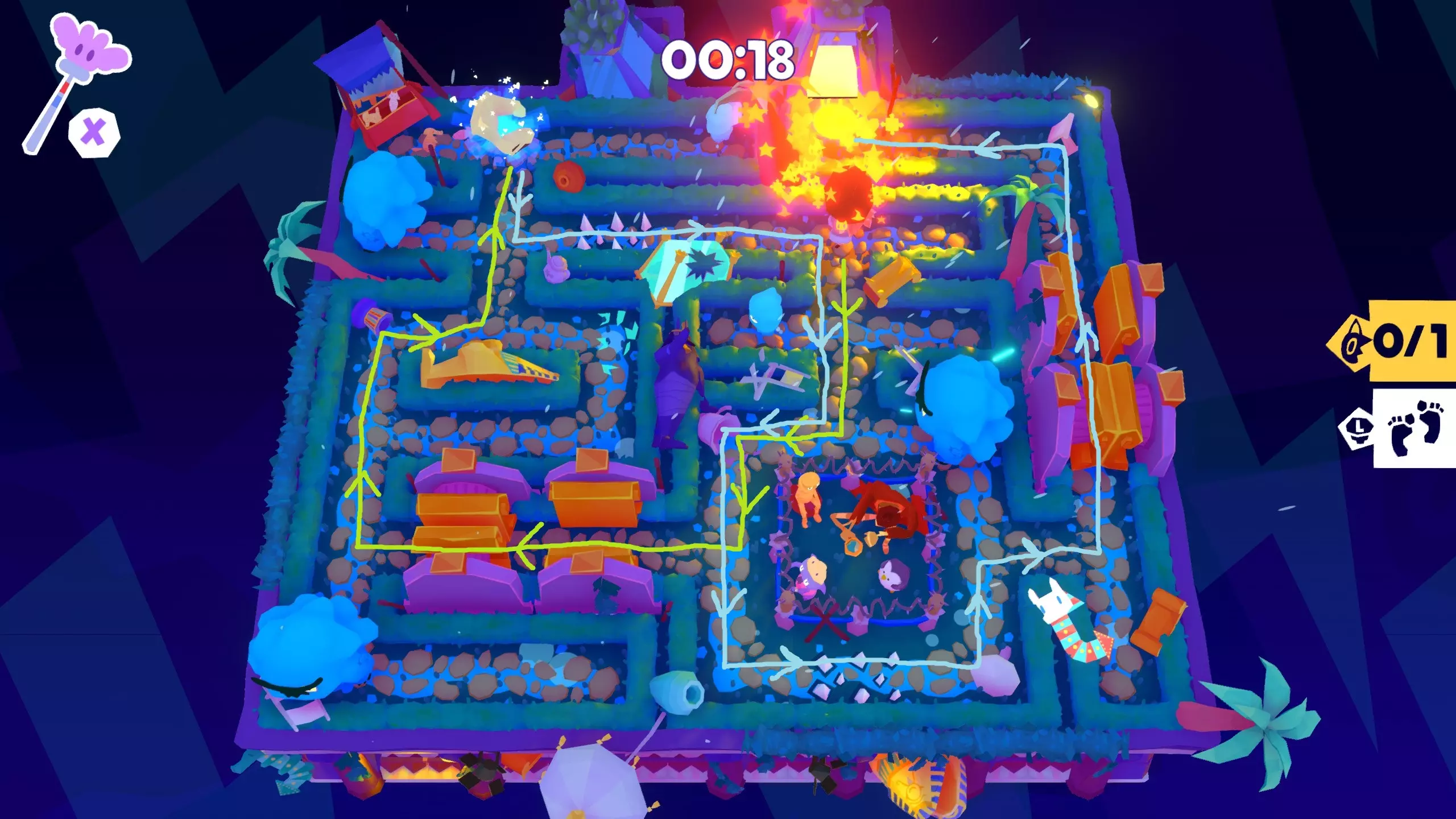 策略:与牛头怪组队,必要时使用小云眩晕来躲避大云。一旦组队成功,尽可能从后方接近云朵。不要追逐云朵,它们跑得足够快,能一直领先于你。一旦被它们发现,就朝相反方向跑以抓住它们。 注意事项:小云只会让你短暂眩晕,之后你会获得一段无敌时间。当你或牛头怪其中一方被眩晕时,你们可以组队。云朵会沿着蓝色路线移动,但如果发现你,它们会冲出路线。每抓住一朵云能获得额外2秒时间,这使得本关比H58简单得多。你不需要捡起或踢进足球,但踢进足球会算作抓住一朵云。H60 - 安全许可 H60关卡与H59类似,需要你同时控制自己和保安,协作消灭所有云朵。由于尖刺以及你和同伴之间存在更多大型风暴云,所以它比H59更难。 目标:消灭全部8朵云 需要注意的是,无需到达箭头所示的【出口】。你只需消灭所有云朵即可完成本关卡。