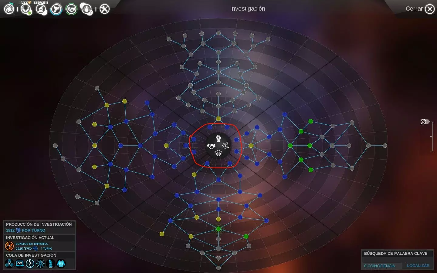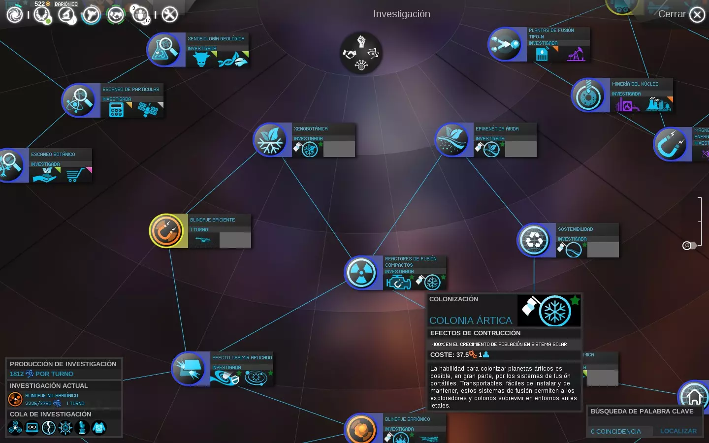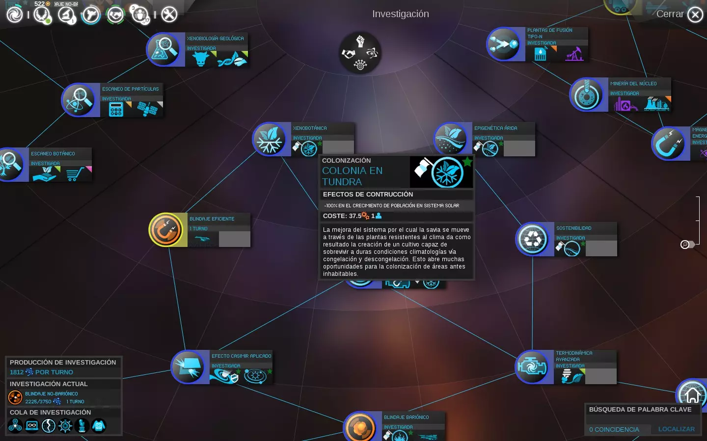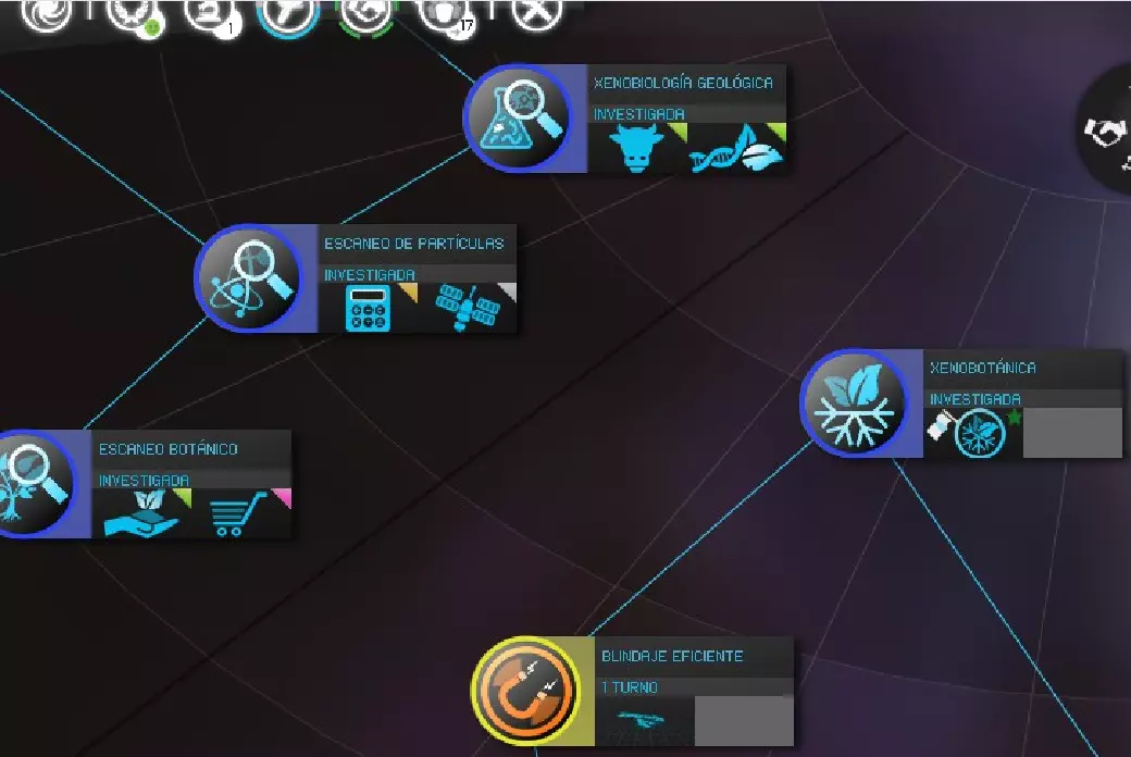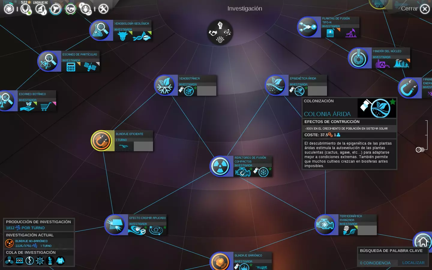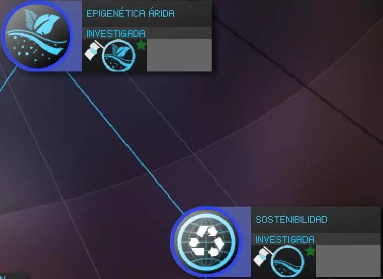 图例:将鼠标滚轮调至最大缩放级别时,颜色代表以下研究状态: - 灰色:当前不可用。 - 黄色:当前可用。 - 蓝色:已研究。 - 绿色:位于研究队列中等待。 - 绿色带圆圈:位于研究队列首位。 按住【Ctrl】或【Shift】键并同时点击鼠标,可将多项研究添加到队列中等待,以更好地利用资源和时间。这样,若在同一回合完成一项研究,将自动开始下一项研究,若其花费不太高,有望在本回合内完成。2- 干旱表观遗传学:可殖民干旱星球的可能性
