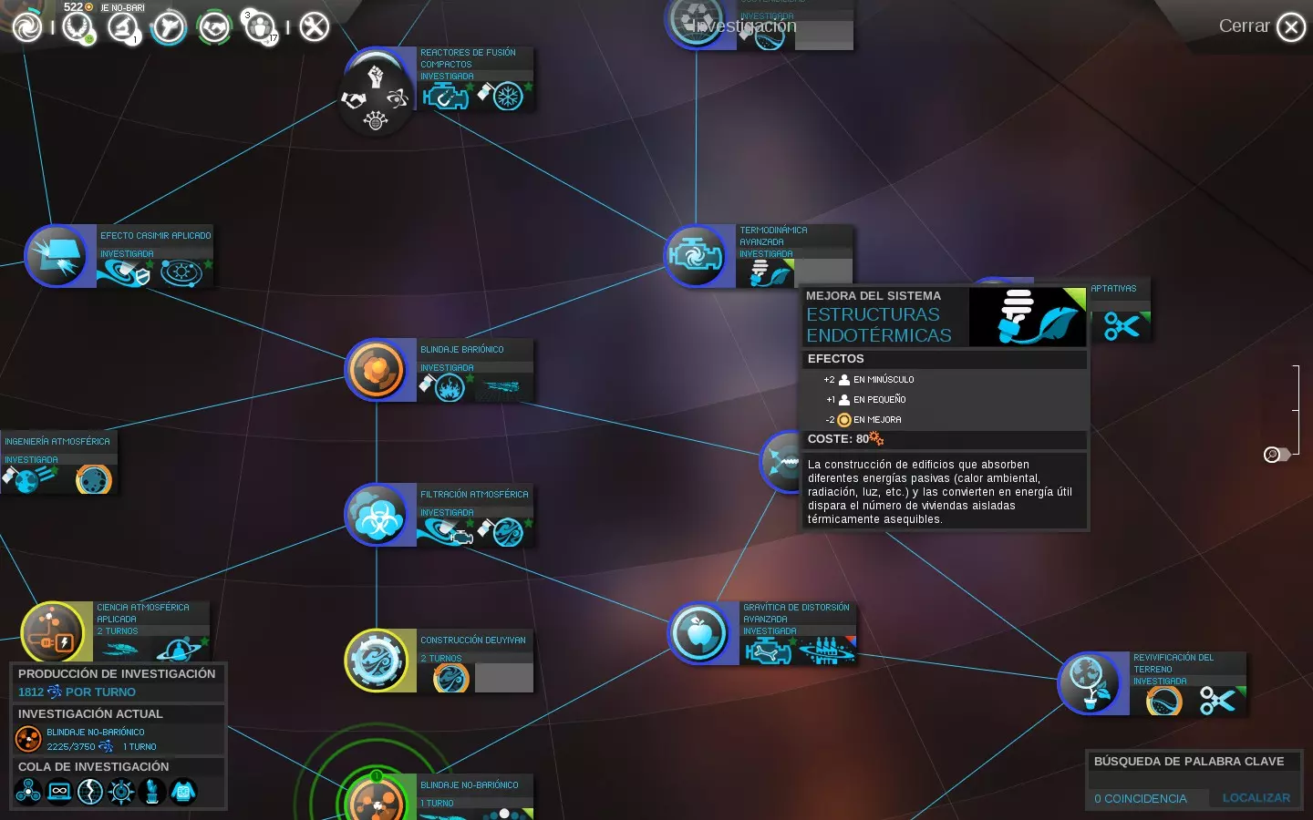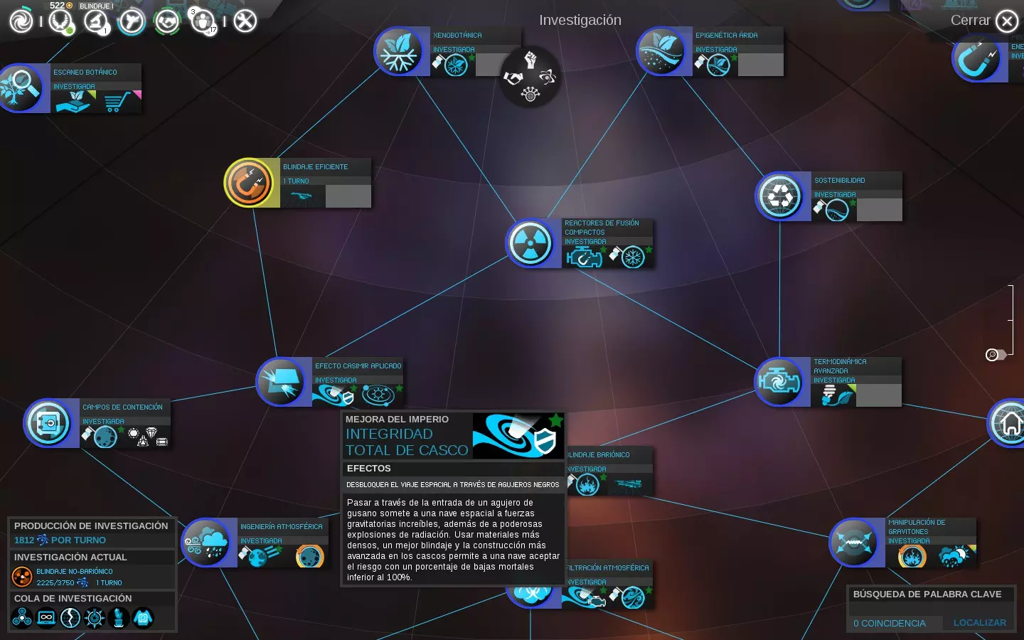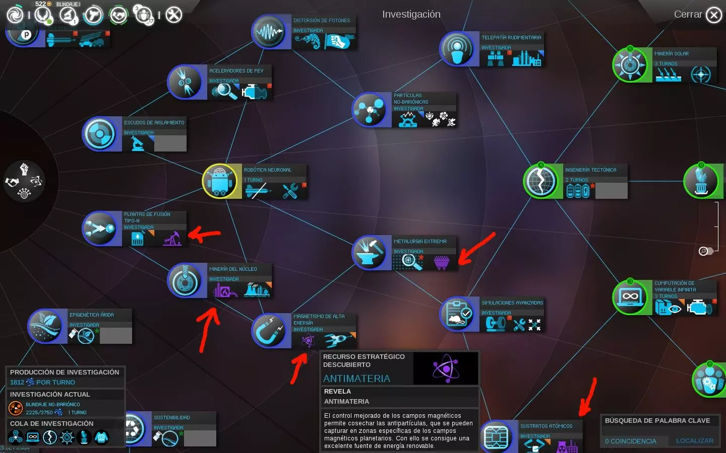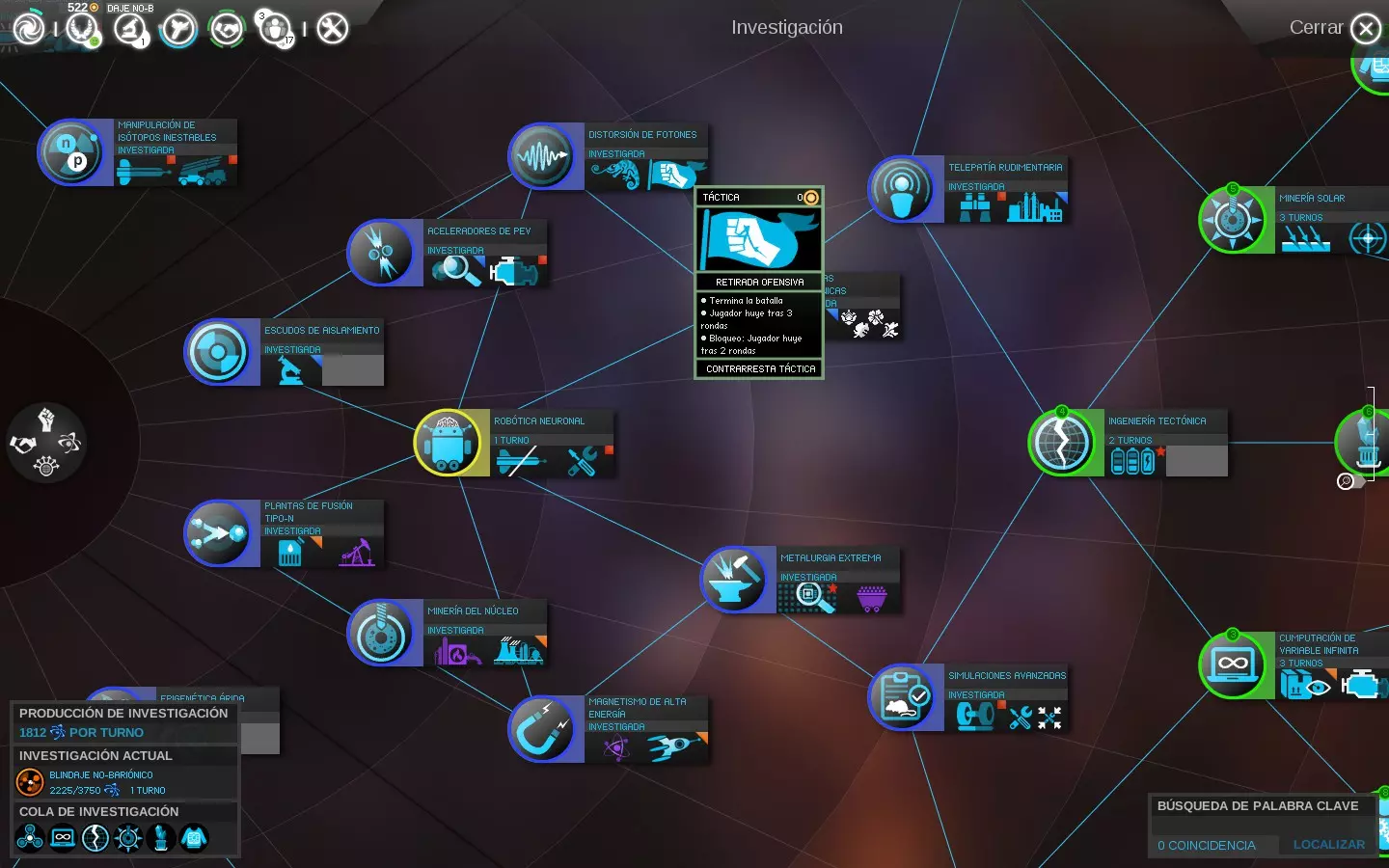 图例:将鼠标滚轮调至最大缩放级别时,颜色代表以下研究状态: - 灰色:当前不可用。 - 黄色:当前可用。 - 蓝色:已研究。 - 绿色:位于研究队列中等待。 - 绿色带圆圈:位于研究队列首位。 按住【Ctrl】或【Shift】键并同时点击鼠标,可将多项研究添加到队列中等待,以更好地利用资源和时间。这样,若在同一回合完成一项研究,将自动开始下一项研究,若其花费不太高,有望在本回合内完成。2- 干旱表观遗传学:可殖民干旱星球的可能性