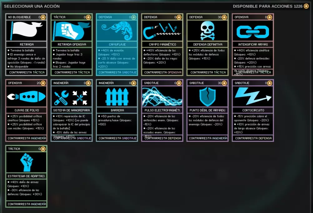 最实用的战斗卡牌/行动: - 进攻性撤退(在处于劣势想要撤退时使用)。 - 短路(敌方精准度-15%,长程武器精准度+10%)。 - 伪装(闪避+40%,伤害-20%)。 - 破坏(敌方护盾效率-20%)。 - 纳米修复系统(修复10%,伤害-10%)。