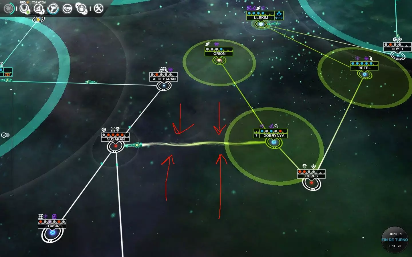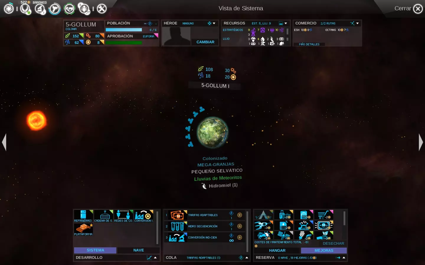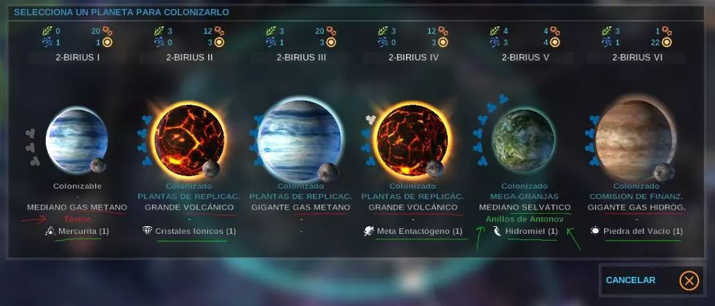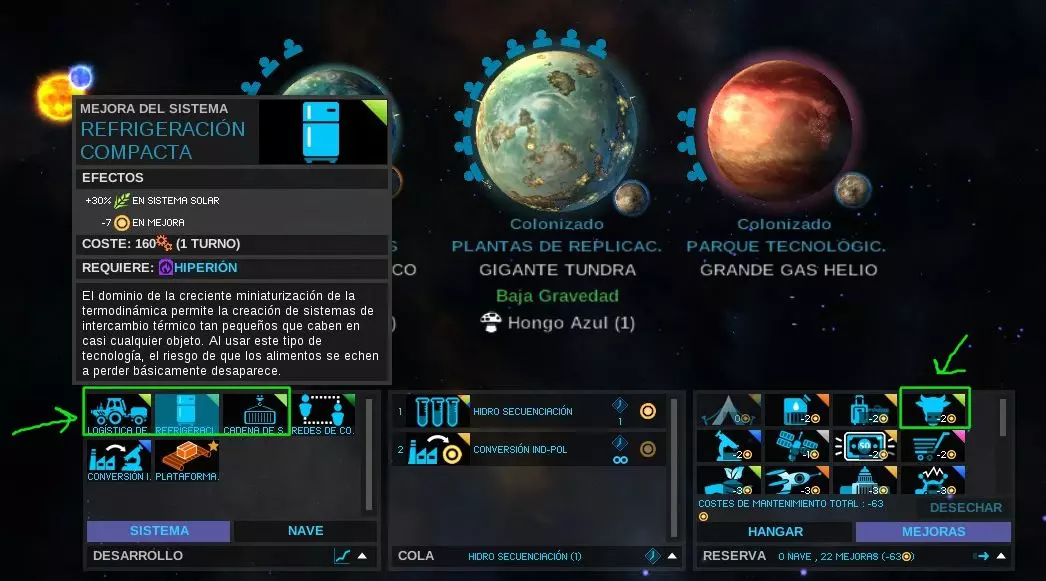 被征服的行星/星系最初应专注于加强能提升食物生产的研究开发(相关图标以绿色三角形标记)