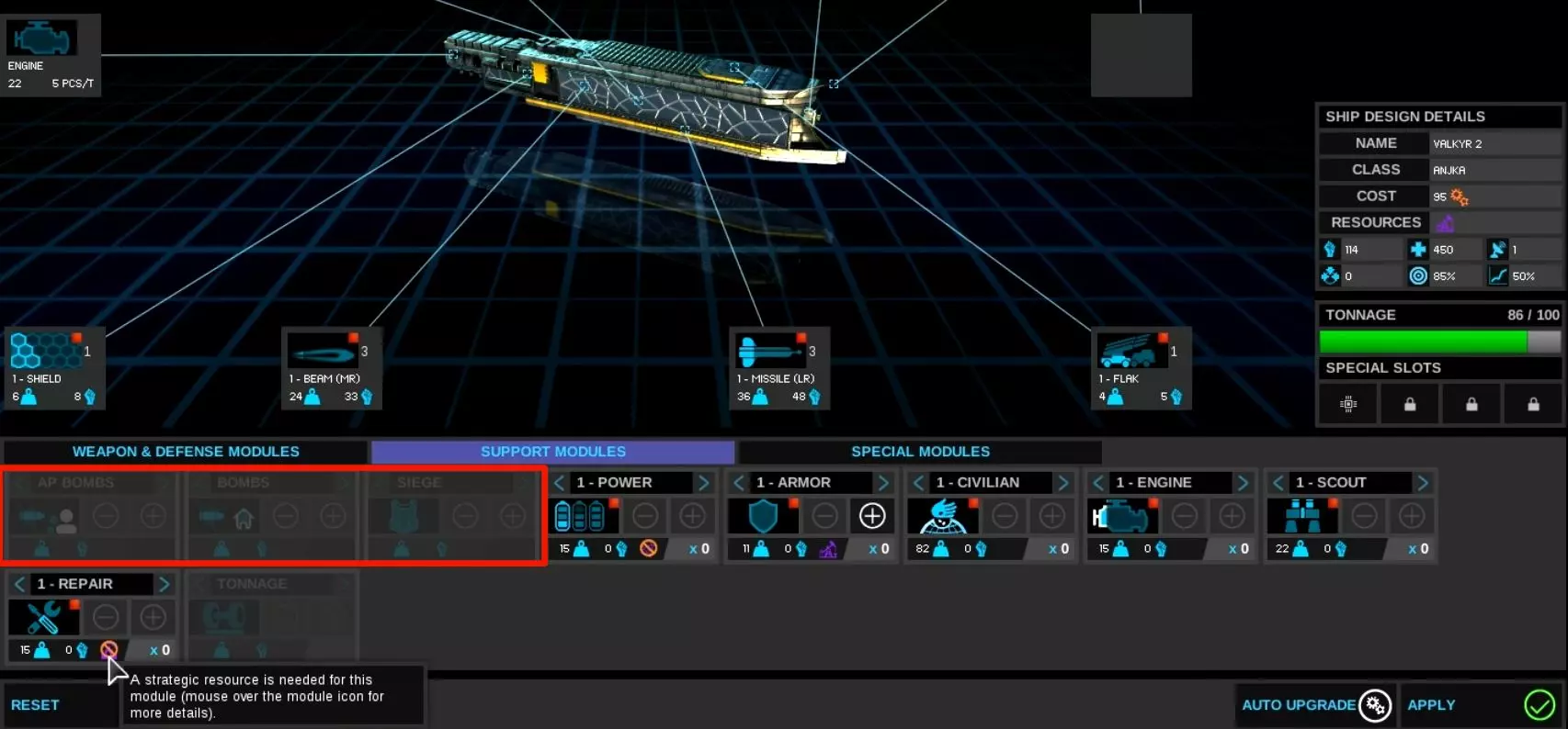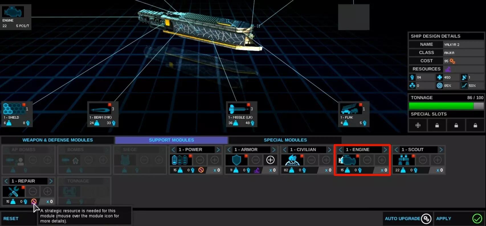 - 初始探索舰无法改装为战舰。需要通过添加装甲和武器来设计探索舰的变种型号。建议让这些变种探索舰先执行探索任务,任务结束后,开启拦截功能,将其部署在虫洞区域或敌人可能入侵的区域进行防御。 - 引擎升级模块会提供少量闪避加成,但无法抵消使用该模块带来的负面效果。