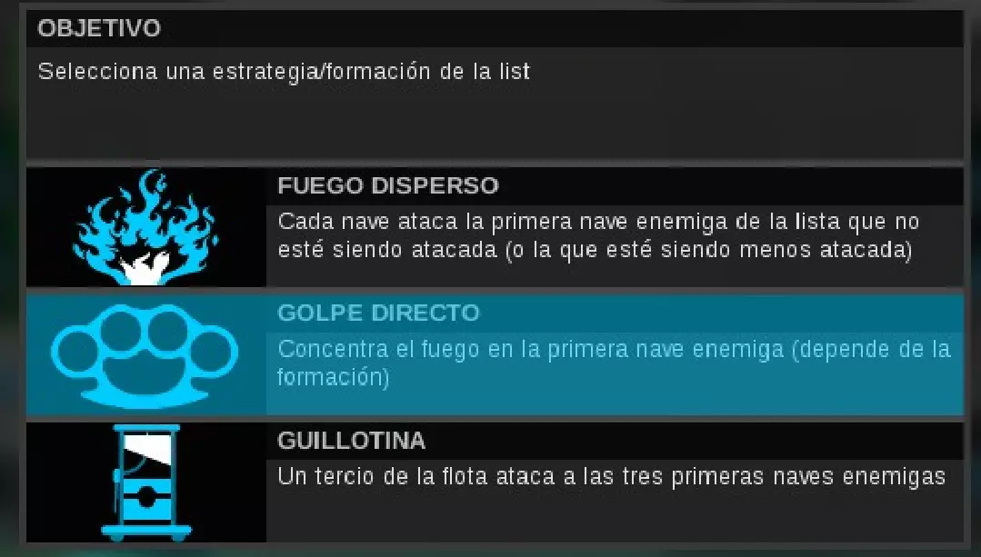 根据战况选择目标: - 分散火力:仅建议在数量处于劣势时使用(例如,拥有的舰船数量为敌方的一半) - 直接打击:舰队集中攻击最近的目标;通常是最有效的方式 - 断头台:33%的舰队攻击3艘最近的目标;适用于需要快速摧毁敌方最危险舰船的情况