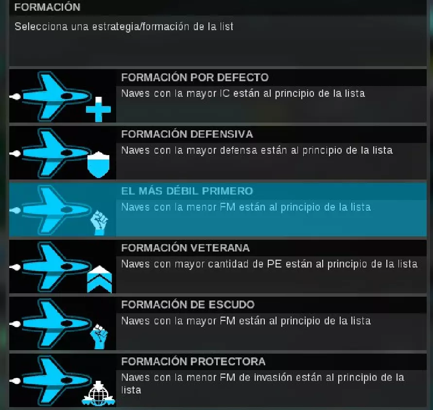 舰队阵型,按有效性从高到低排序: 1. 先弱后强:人工智能通常很容易落入这个陷阱 2. 防御阵型:将防御最高的舰船放在其他舰船前方,以保护它们免受伤害 3. 默认阵型:将船体完整性(即生命值)最高的舰船放在其他舰船前方,以保护它们。 其余阵型由于效果不佳,建议避免使用。