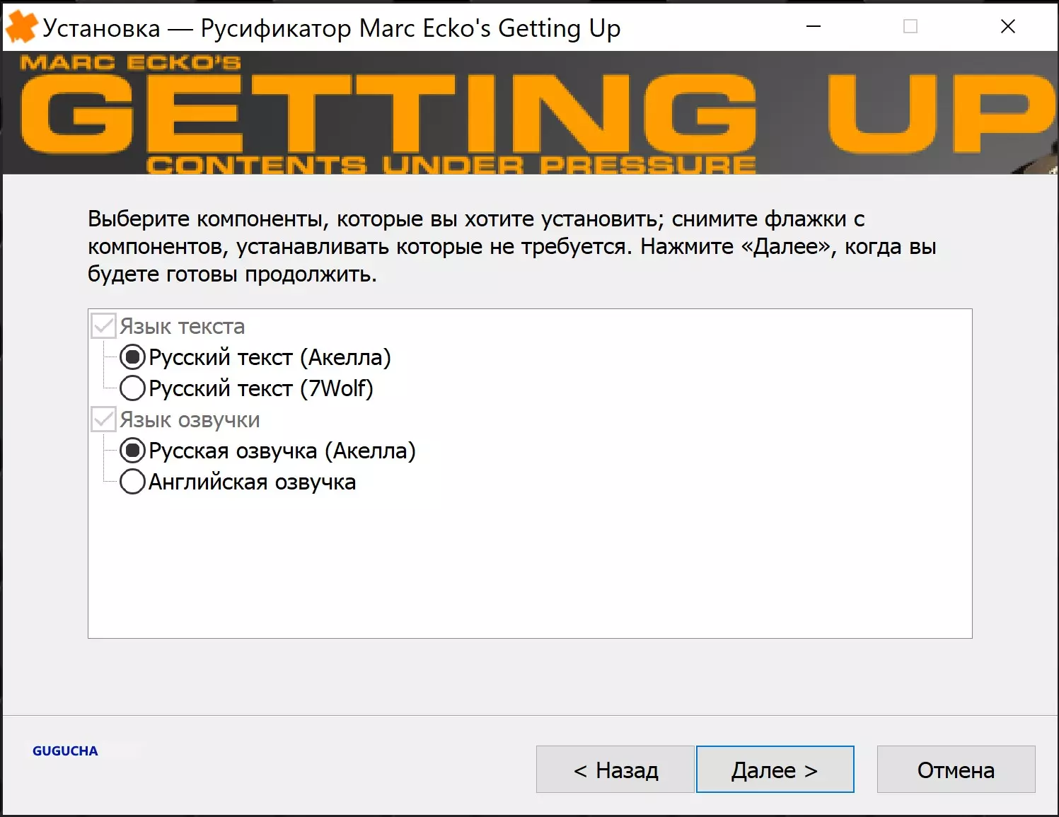 《Marc Eckō's Getting Up: Contents Under Pressure》汉化补丁 汉化补丁 基于Akkela官方完整文本及语音汉化补丁进行优化——减小了文件体积,并增加了语音选择功能,同时还可选添加7Wolf的民间文本翻译。 汉化补丁特点: - 所有内容整合到便捷安装程序中(可自动识别游戏路径) - 文件体积比其他汉化补丁小5倍 - 4种语音安装选项(详见截图) 安装方法 - 运行MarcEcko_RUS。exe - 选择文本和语音选项 - 安装 - 开始游戏 重要!仅安装在纯净的Steam版本上,不使用任何俄语化补丁 截图 文本翻译来自AKELLA