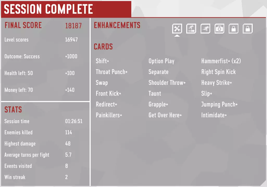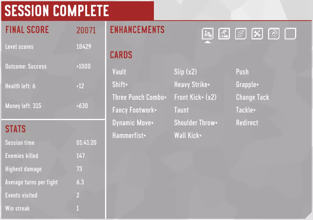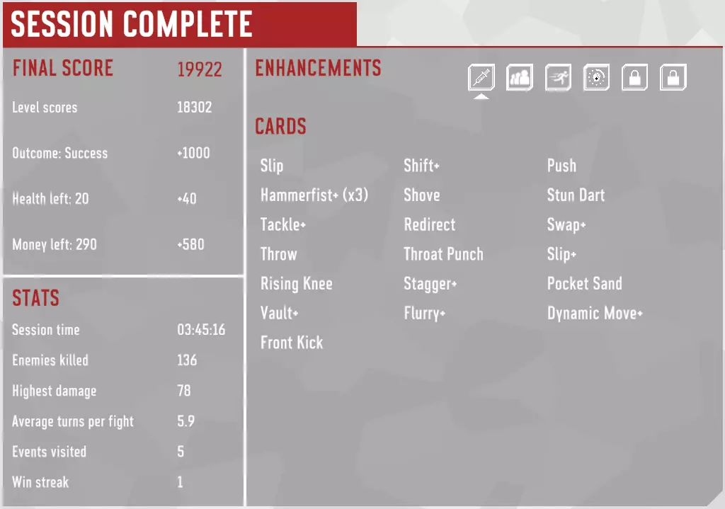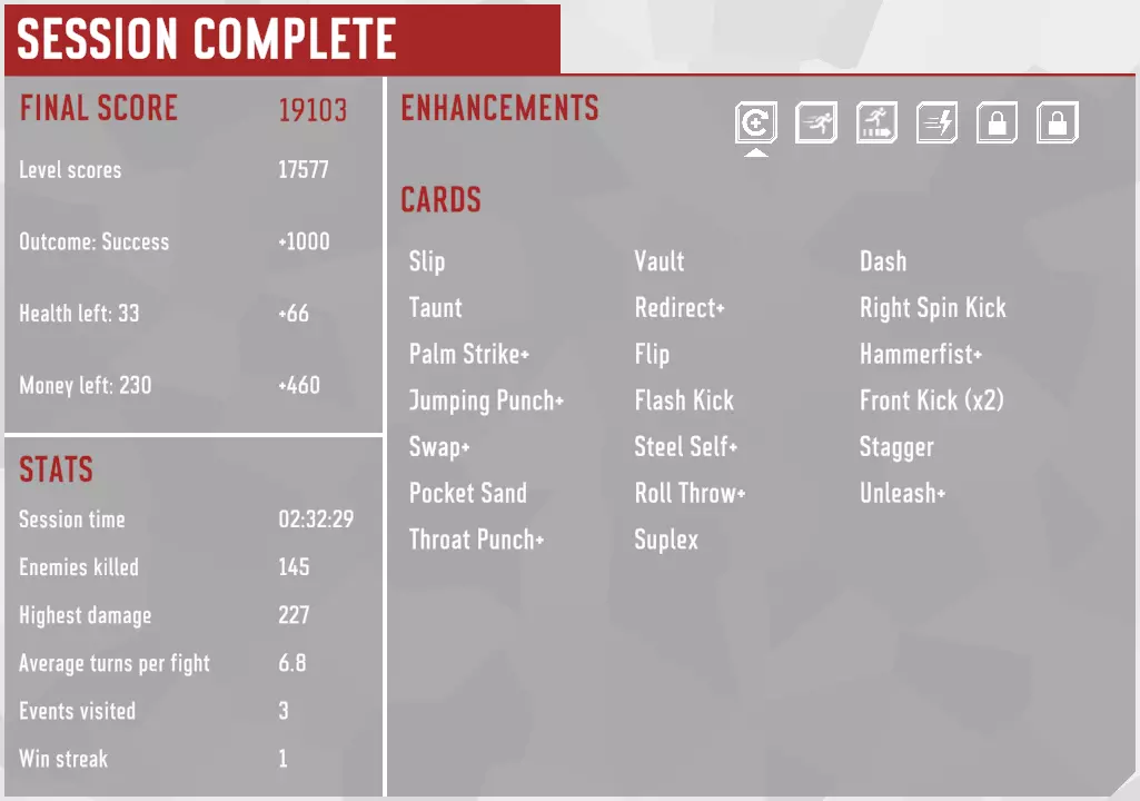 这套卡组并非最优,在选牌和卡牌/强化奖励方面运气欠佳。部分卡牌以及大部分强化都不属于“顶级”。不过它遵循了攻略,而且确实有效。最大动量为5,最大连击数为18。强化包括【强健体魄】、【紧急转移】、【动量提升】和【神经过敏】。