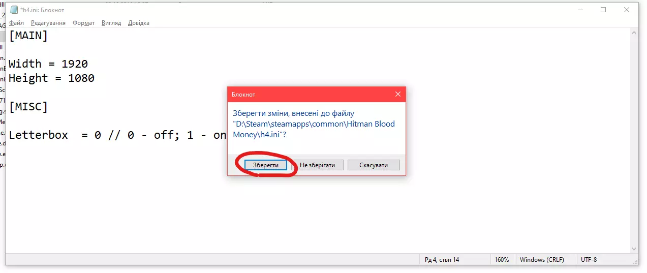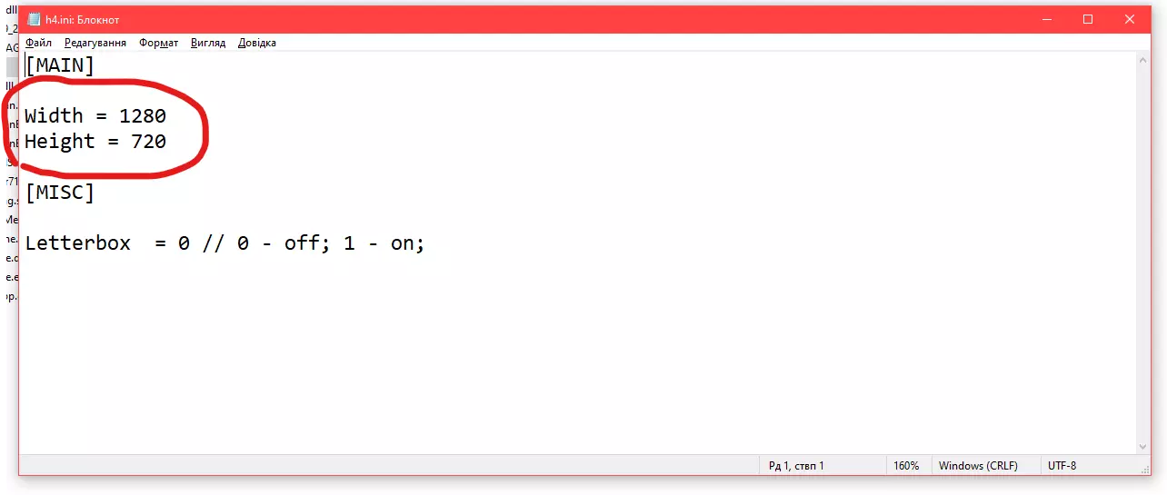 移动文件后,你需要用记事本打开“h4.ini”。这是一个配置文件。在该文件中,你需要修改前两个参数,它们对应着你屏幕的分辨率。