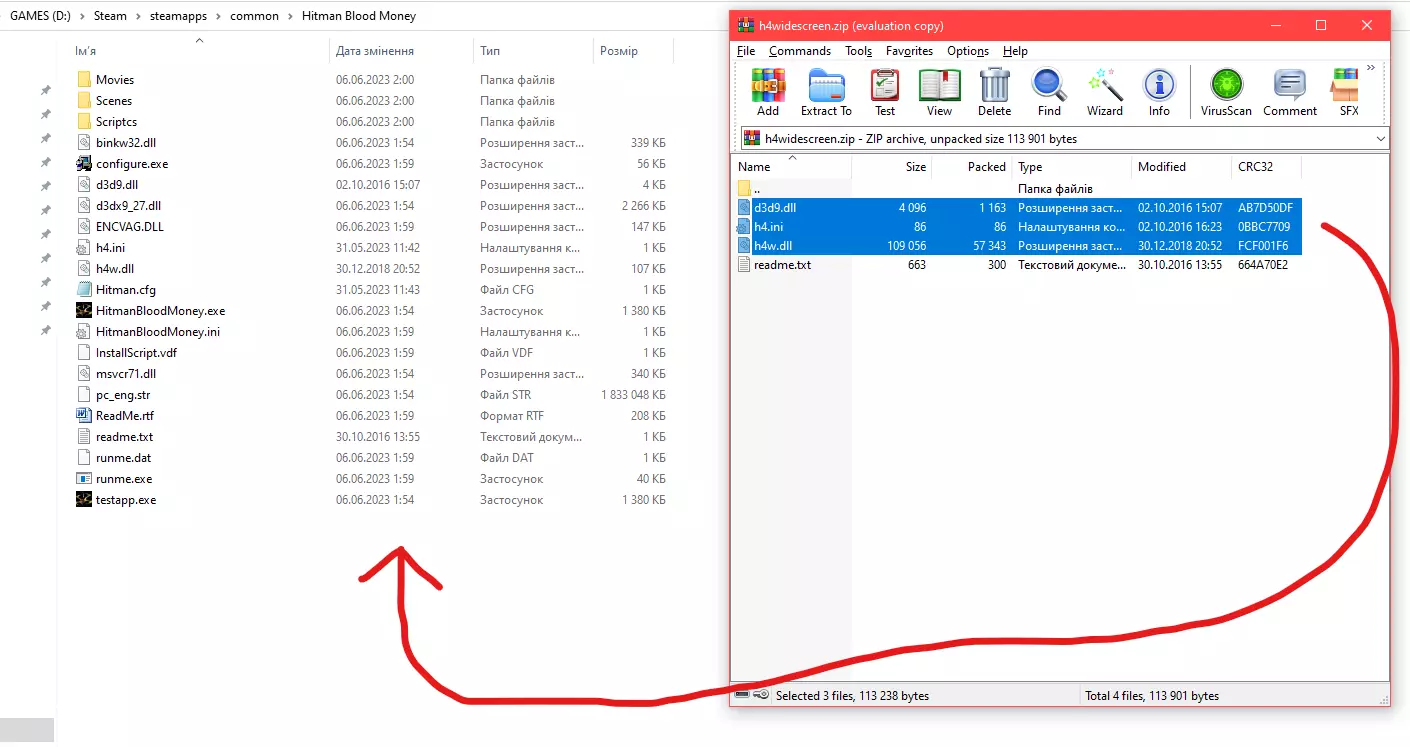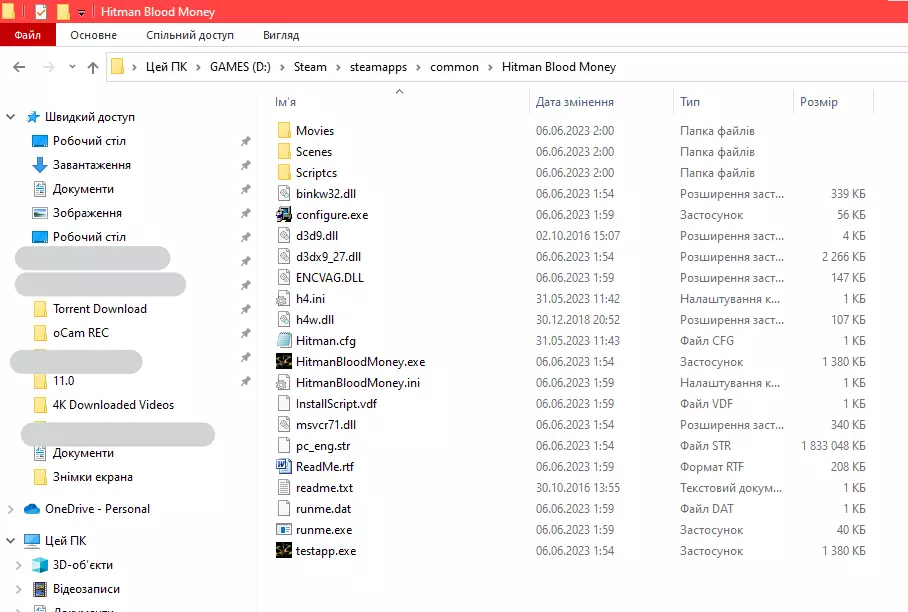 WinRAR中已解压档案的截图 实际上,这些是经过修改的游戏原始文件。关于接下来如何处理它们,你将在下方的下一个步骤中了解到。 安装修复补丁 接下来,我们需要打开《杀手:血钱》的游戏文件夹。该文件夹位于“common”文件夹内,而“common”文件夹又位于“steamapps”文件夹中,“steamapps”文件夹则在“Steam”文件夹里。至于“Steam”文件夹的具体位置,每个人的情况都有所不同。简而言之,游戏文件夹在文件资源管理器中的路径如下:安装Steam客户端的磁盘:\steamapps\common\Hitman Blood Money。顺便说一下,游戏文件夹就是这样的。